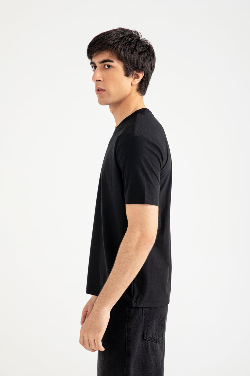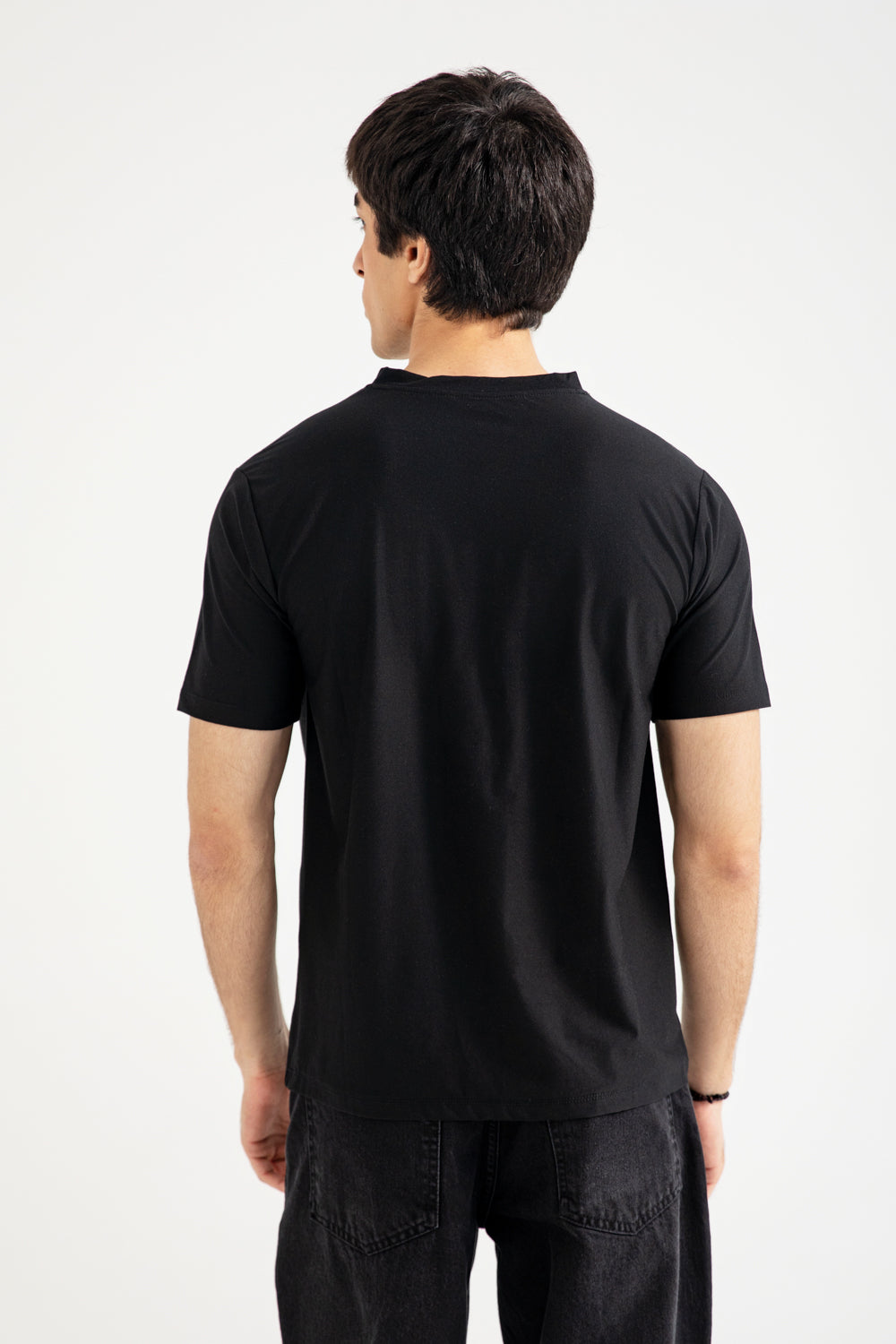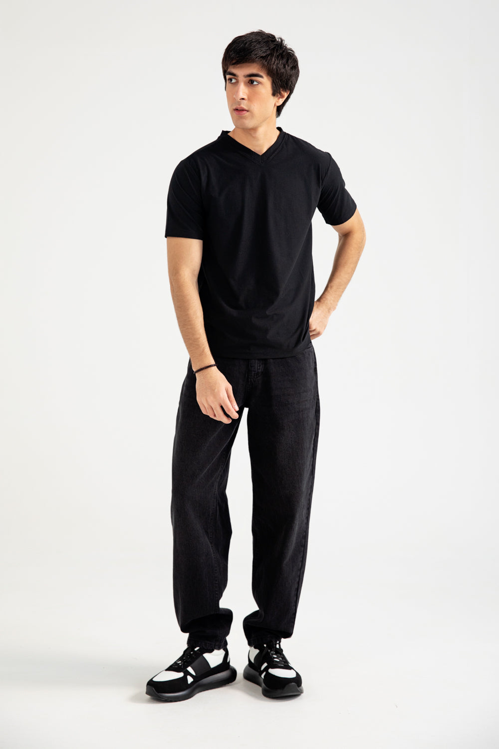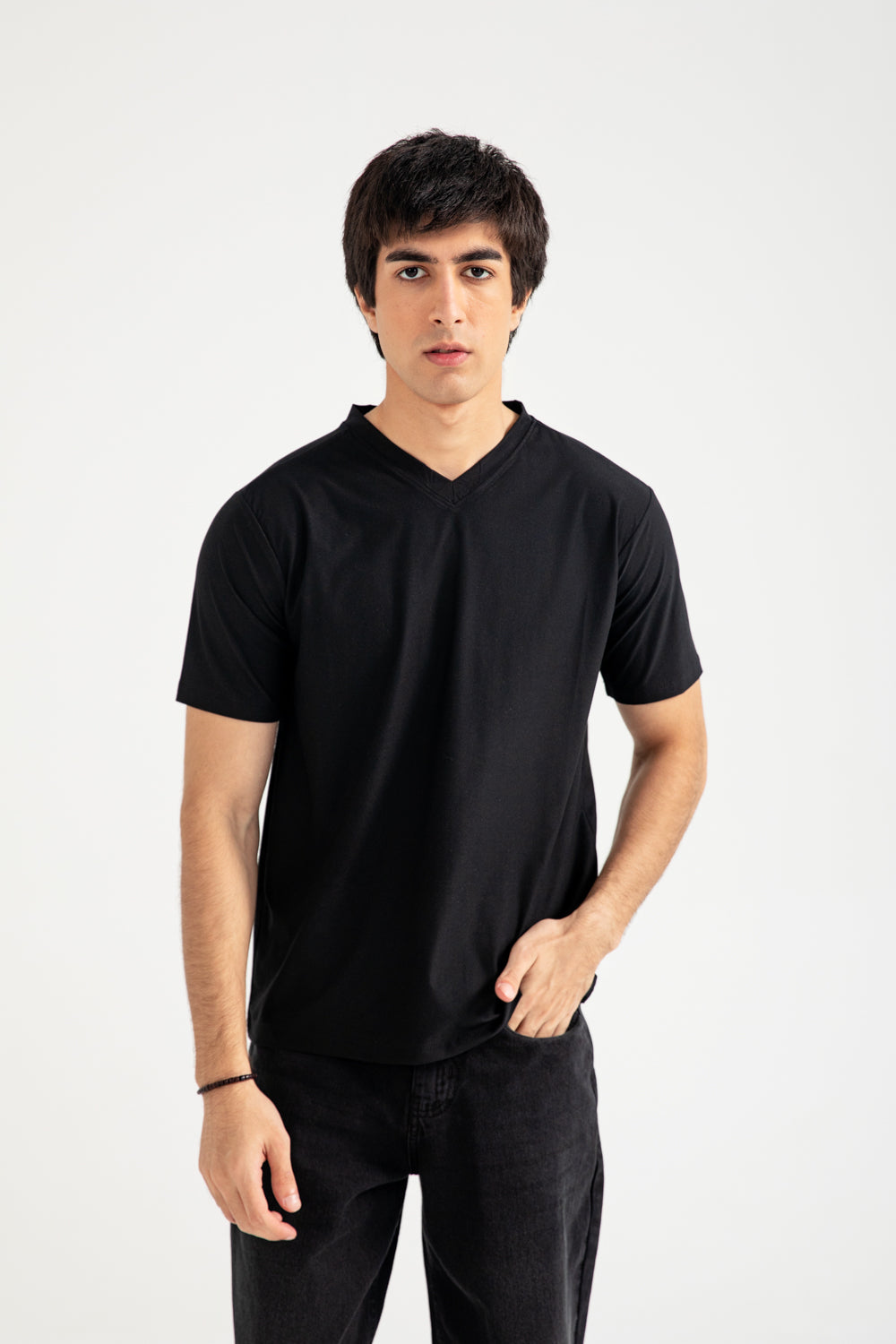 Black plain tee made from stretchy cotton with a classic V neckline.