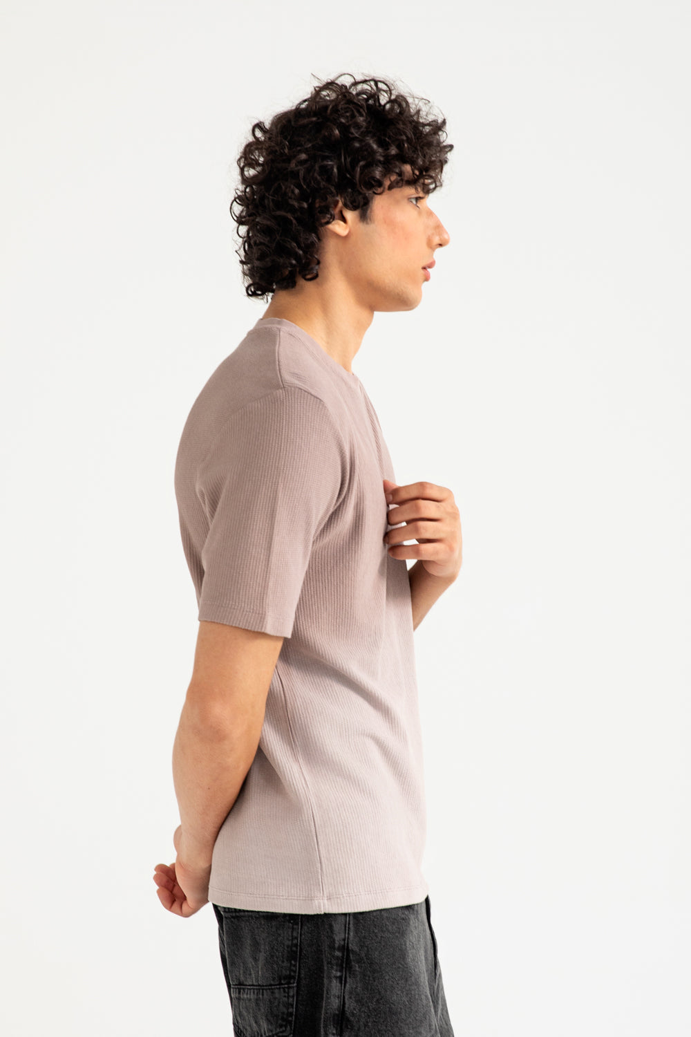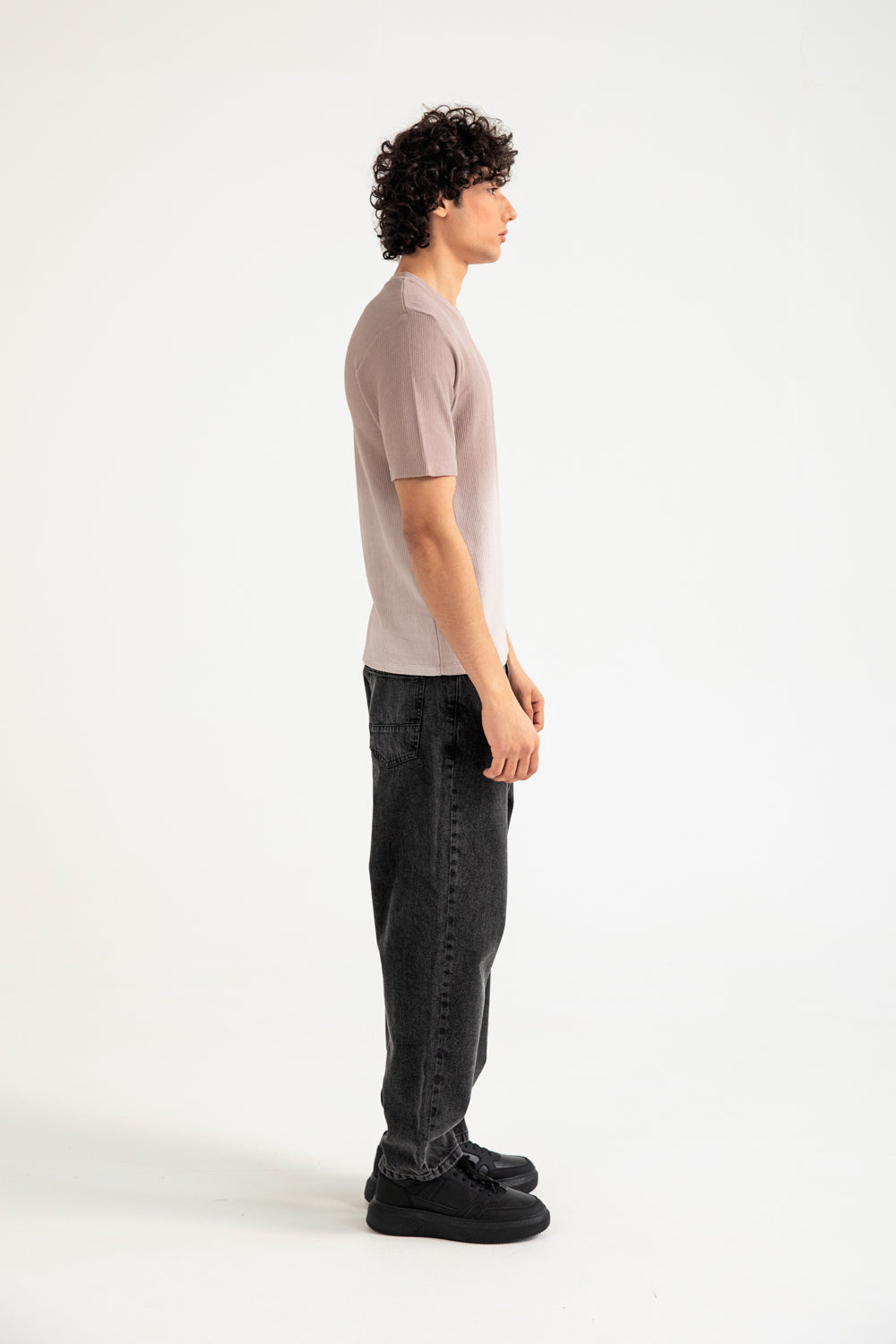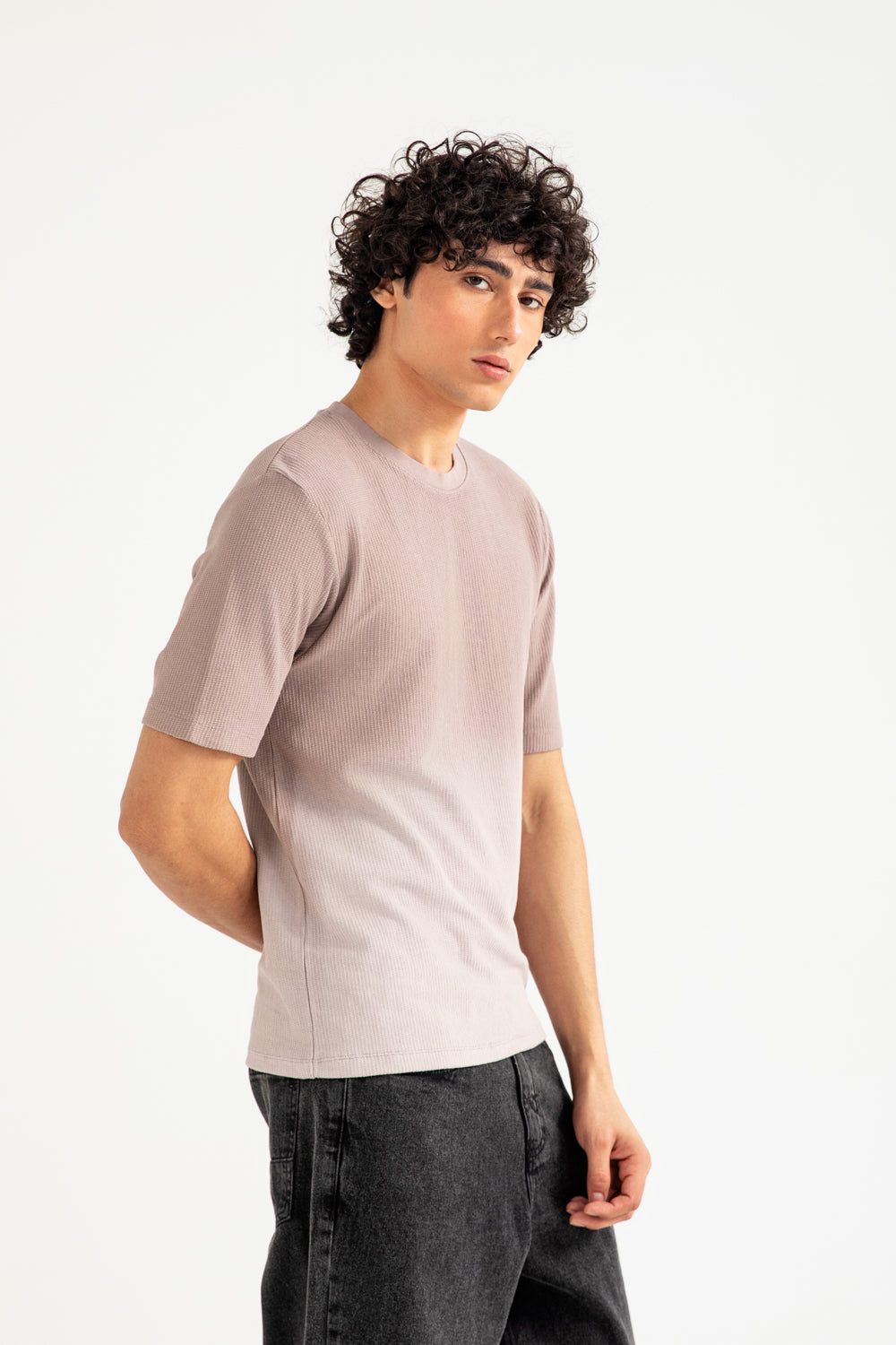 Sand colored cotton tee with a textured finish, featuring a faded washed effect that transitions from bottom to top on both front and back.