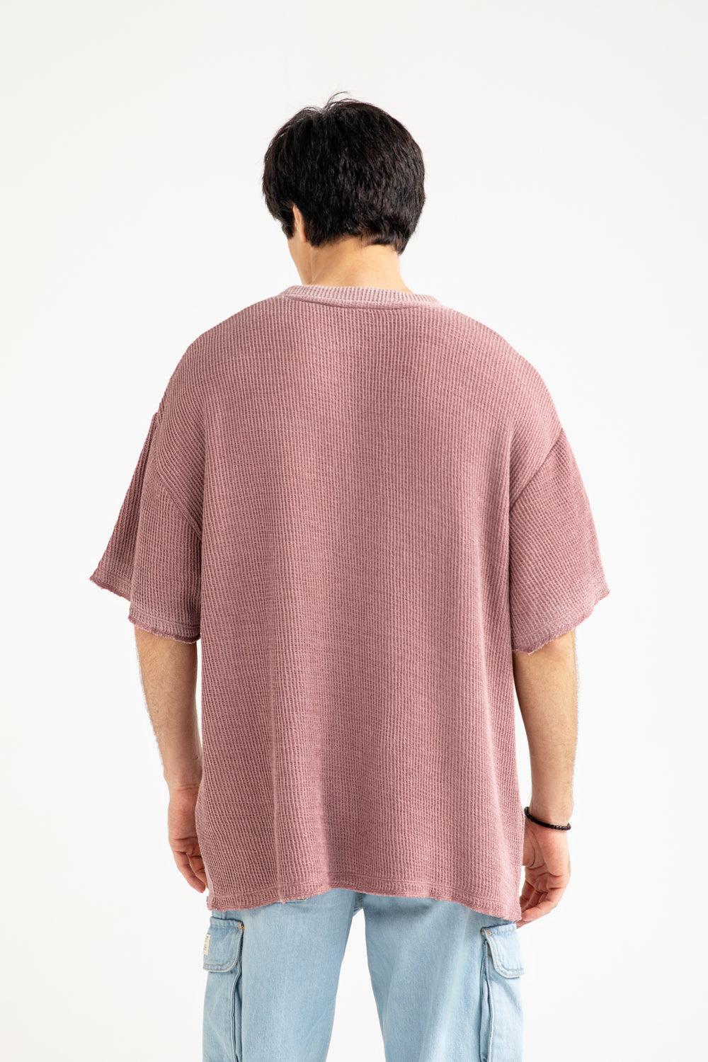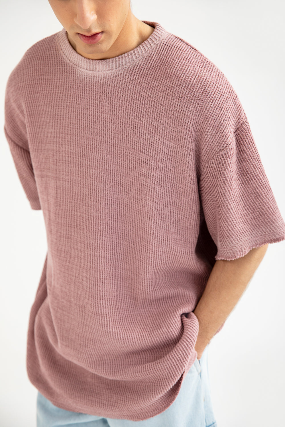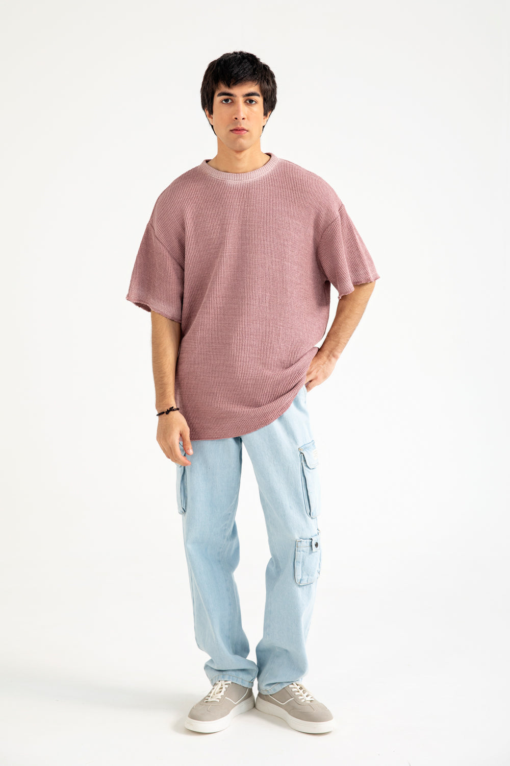 Dusky pink cotton tee in a baggy fit with a textured finish, featuring a faded color effect on the neckline and sleeve hems.