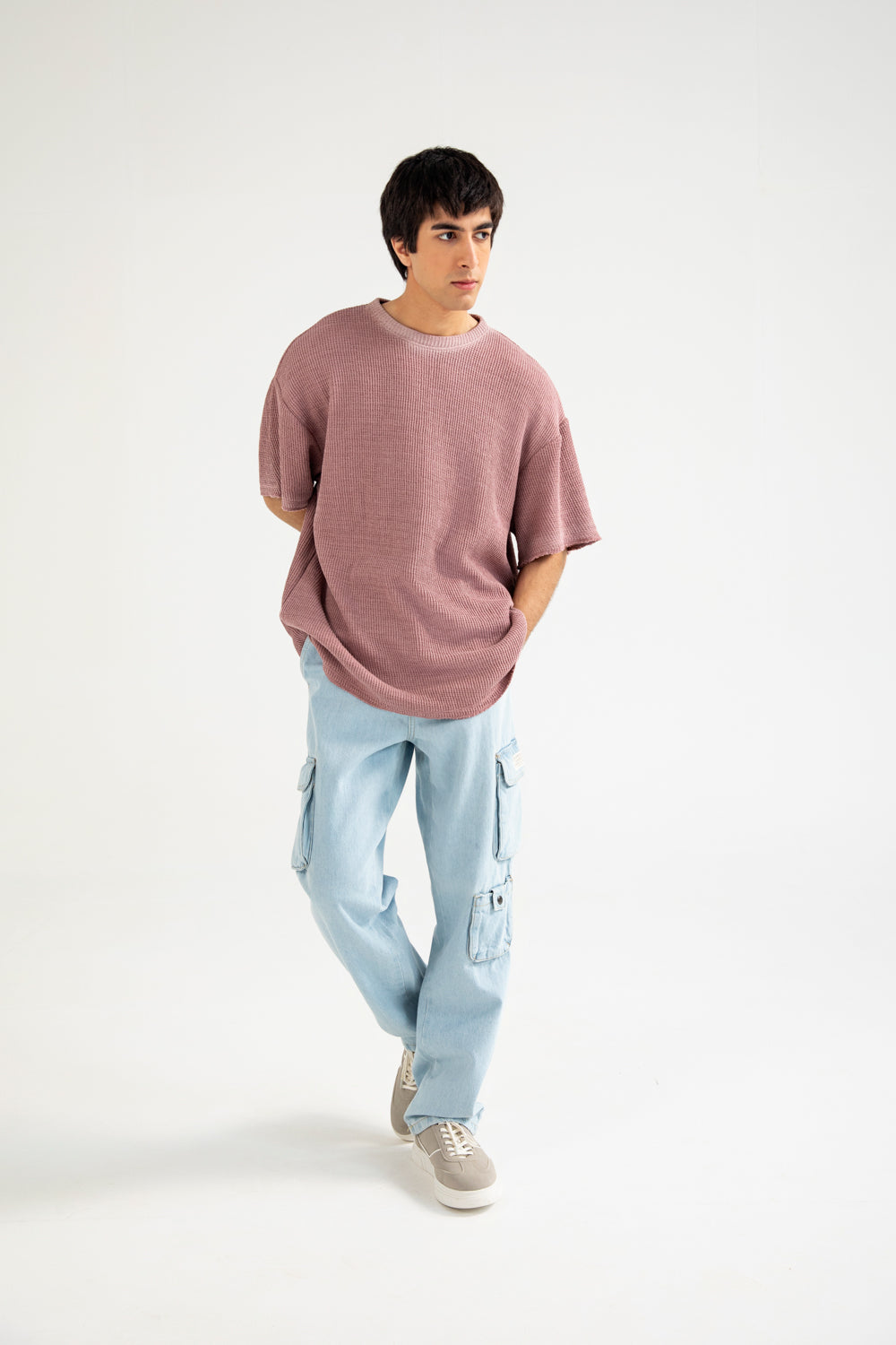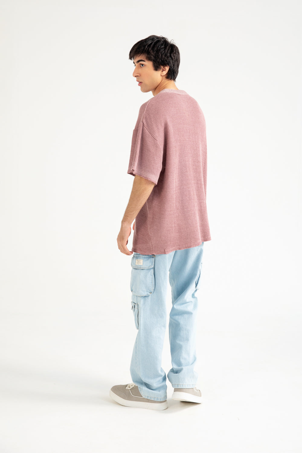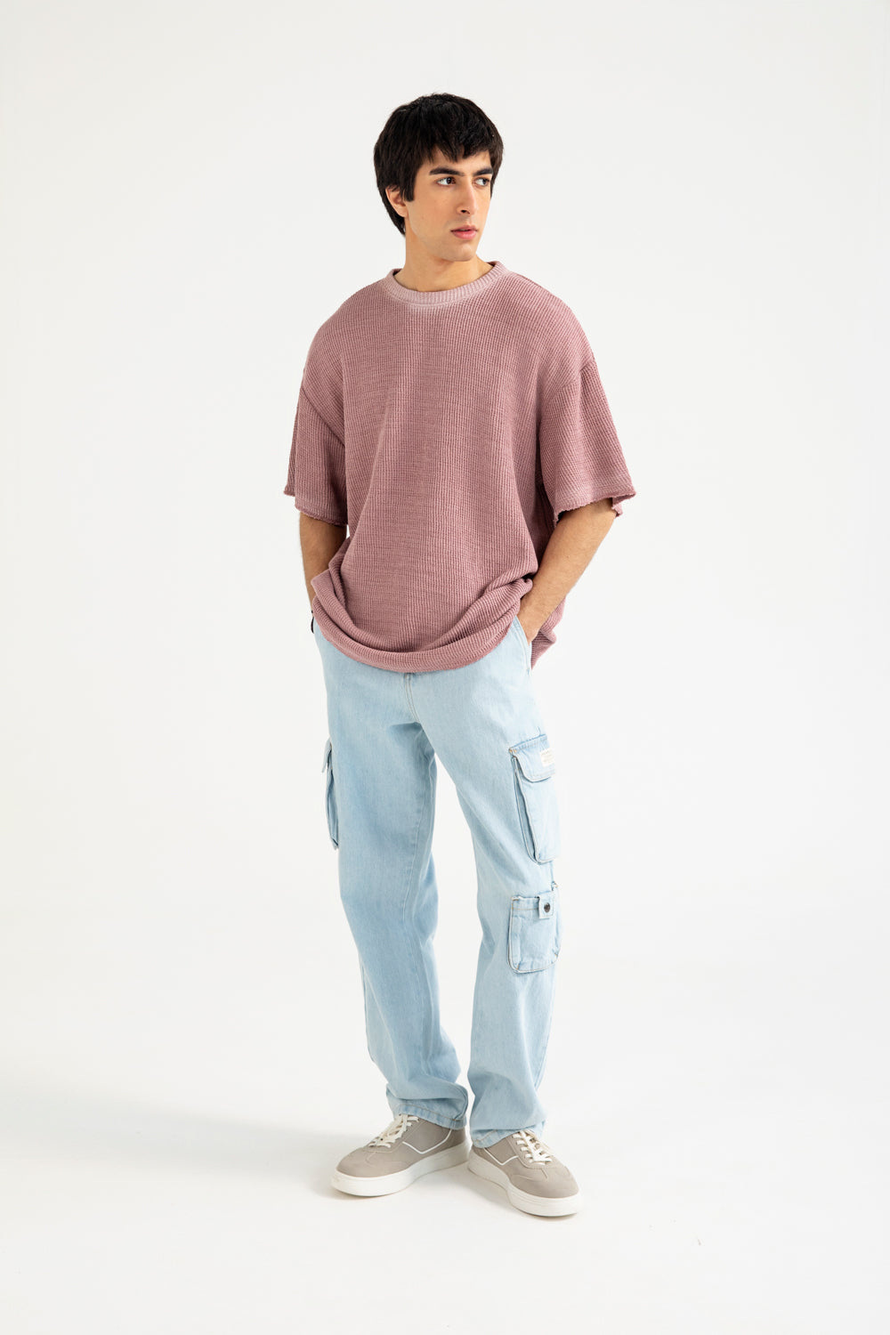 Dusky pink cotton tee in a baggy fit with a textured finish, featuring a faded color effect on the neckline and sleeve hems.