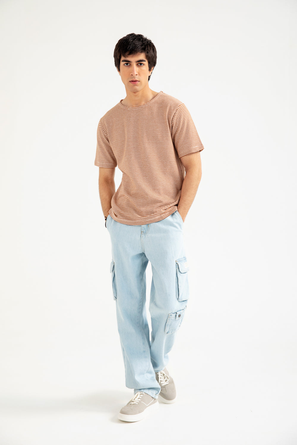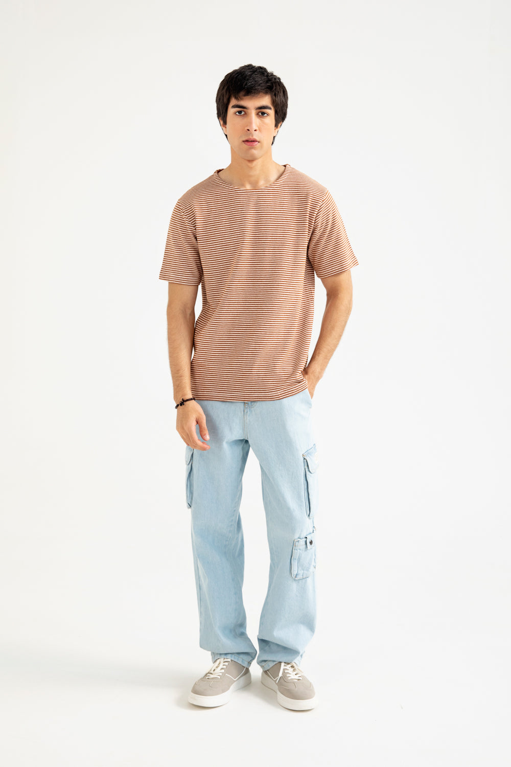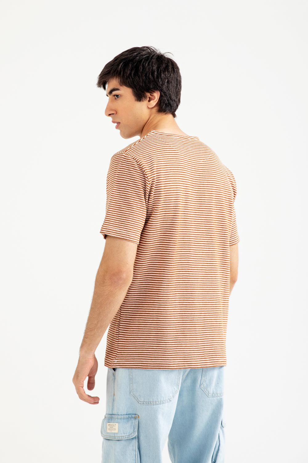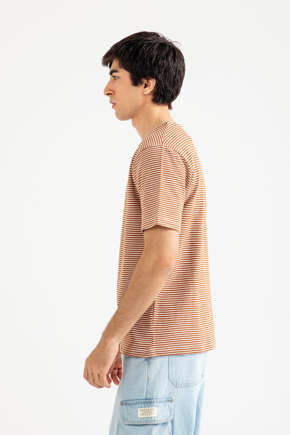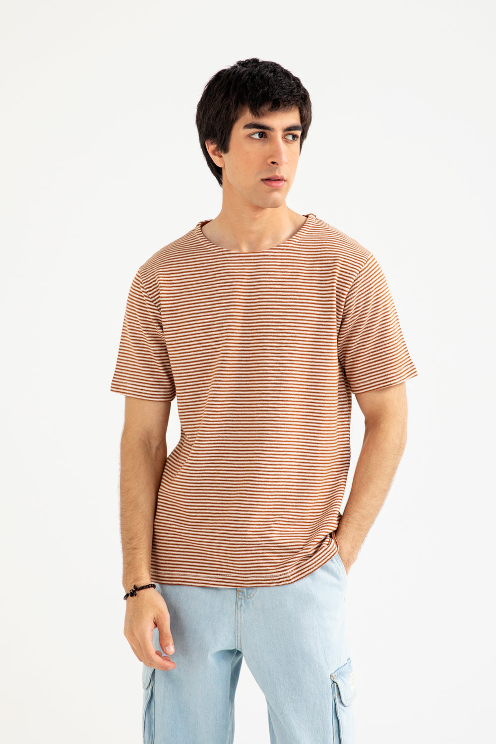 Brown and white cotton tee in a regular fit with horizontal stripes and a textured finish.