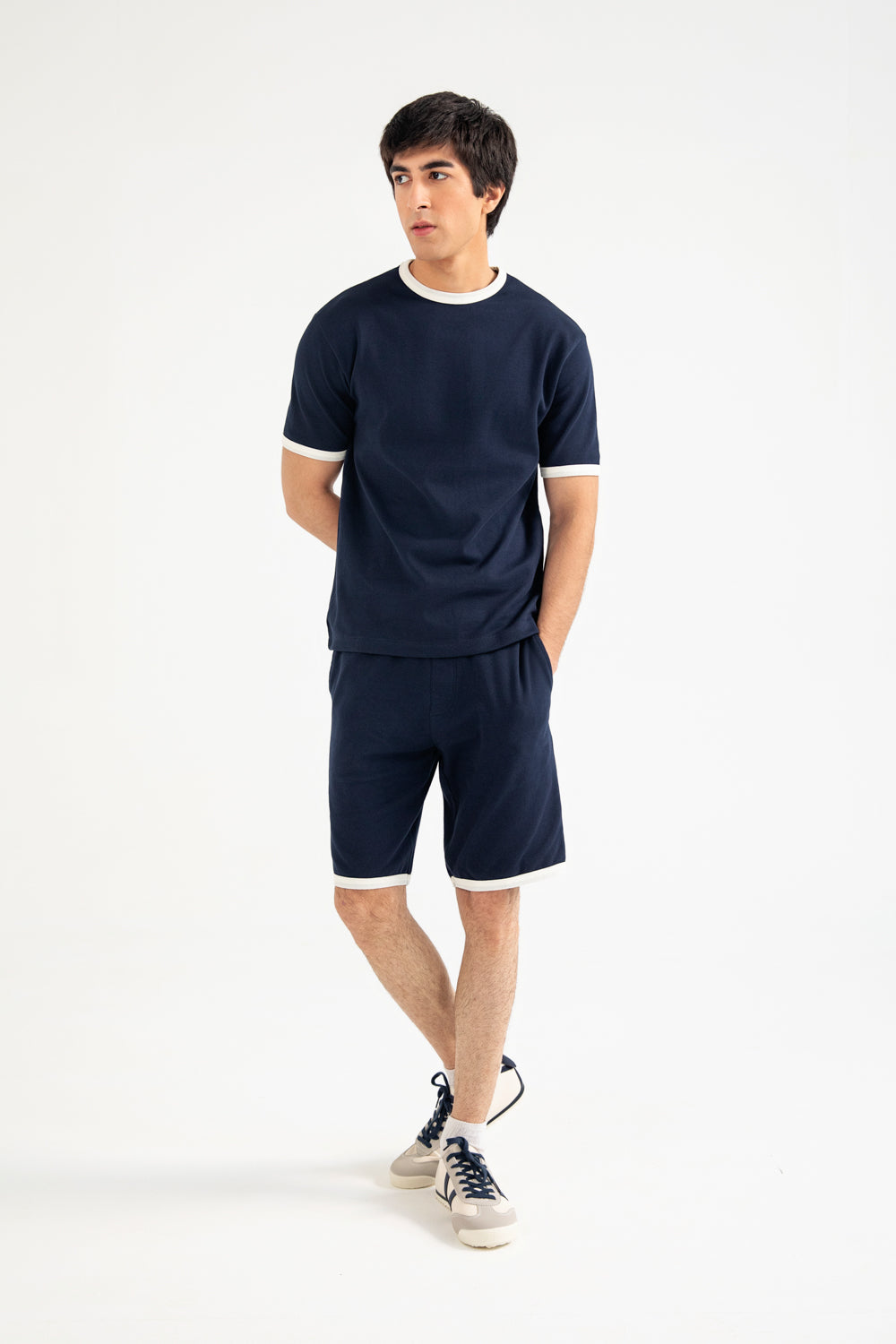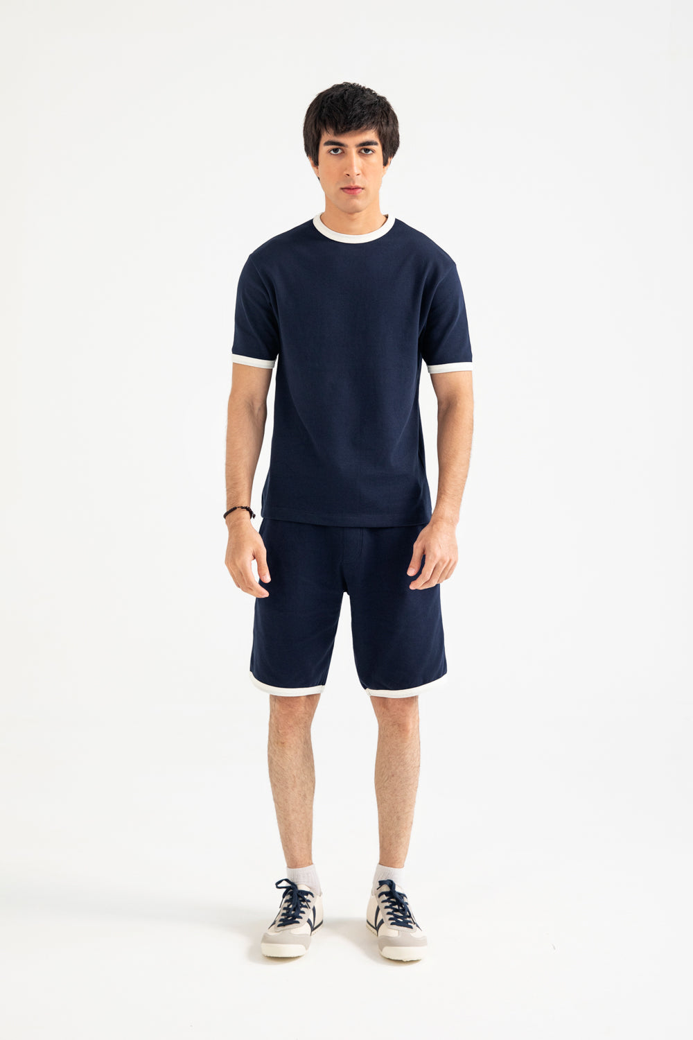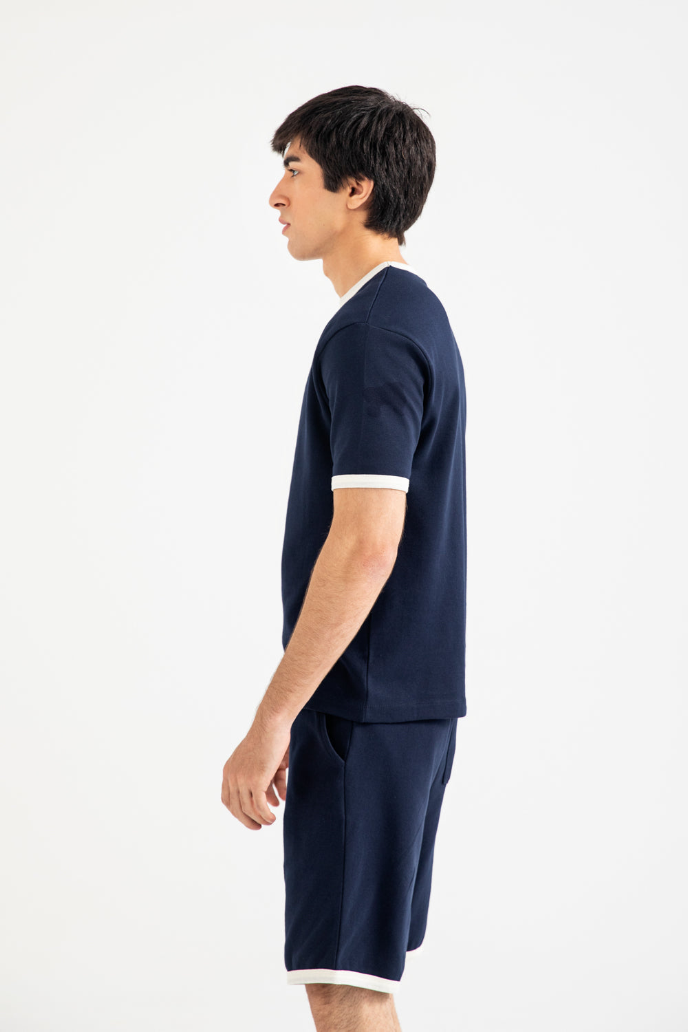 Navy muscle fit tee in a stretchy cotton synthetic blend, finished with contrasting trim on the neckline and sleeves.