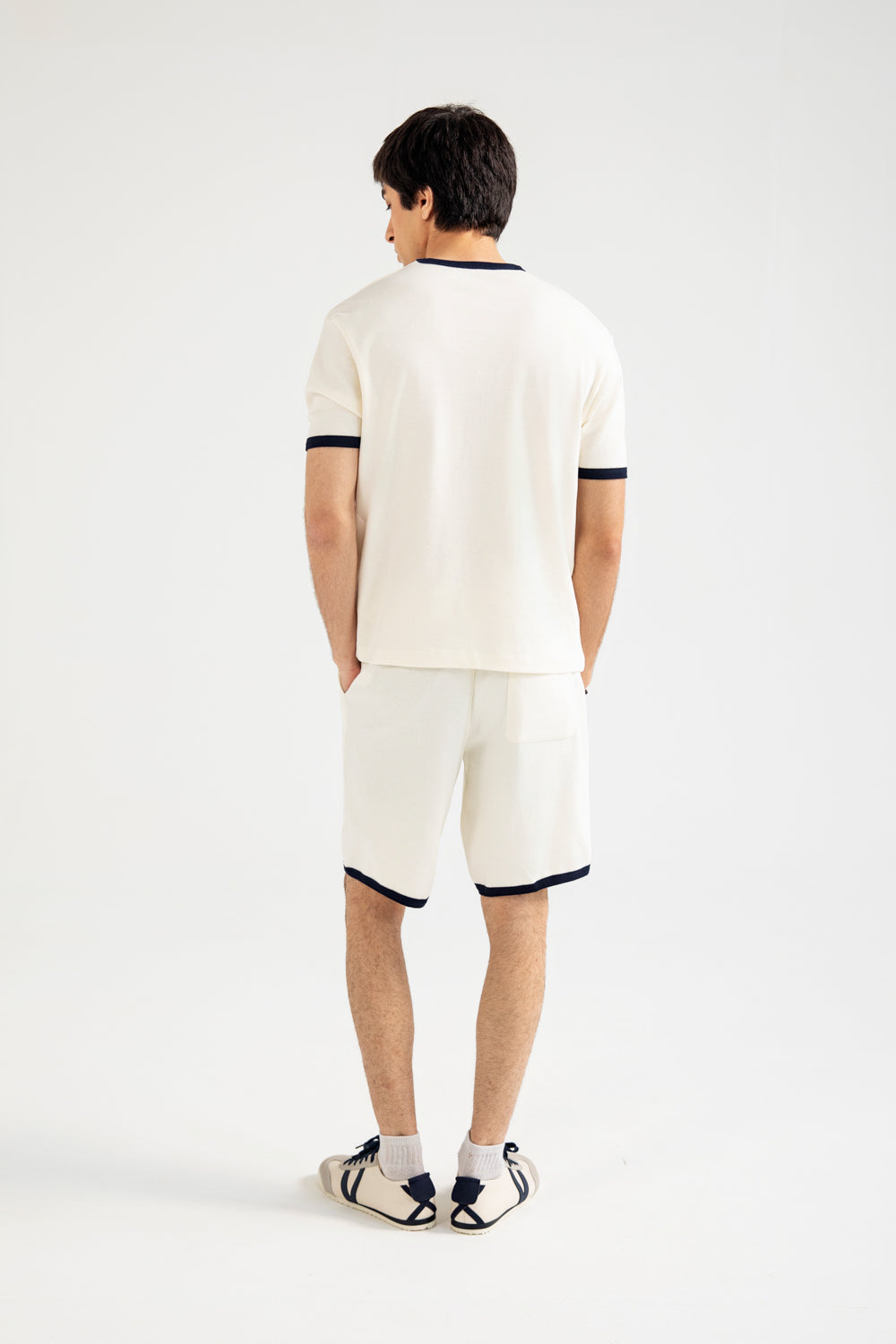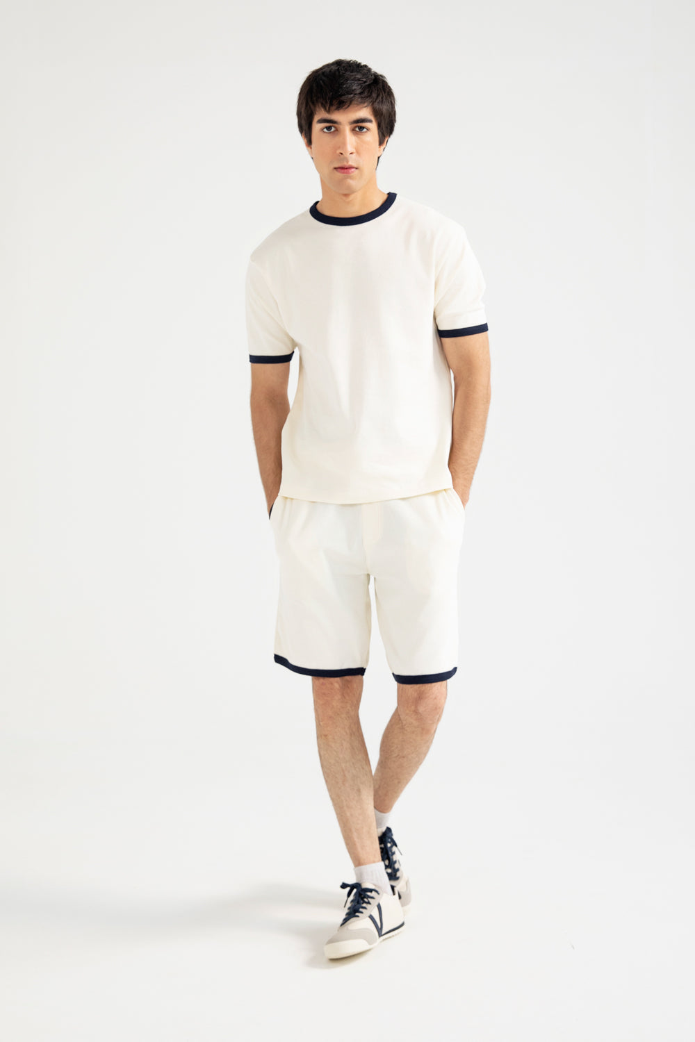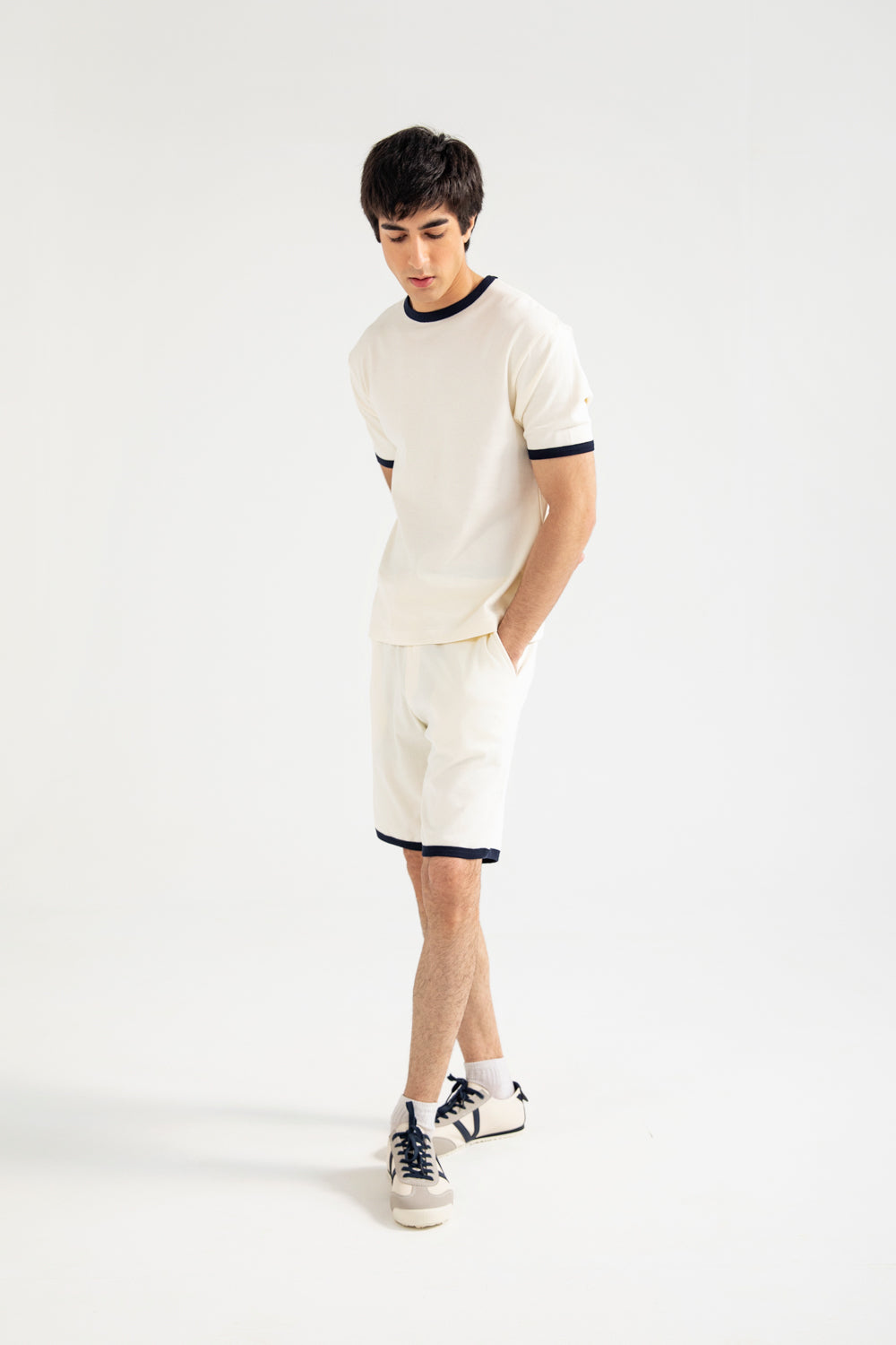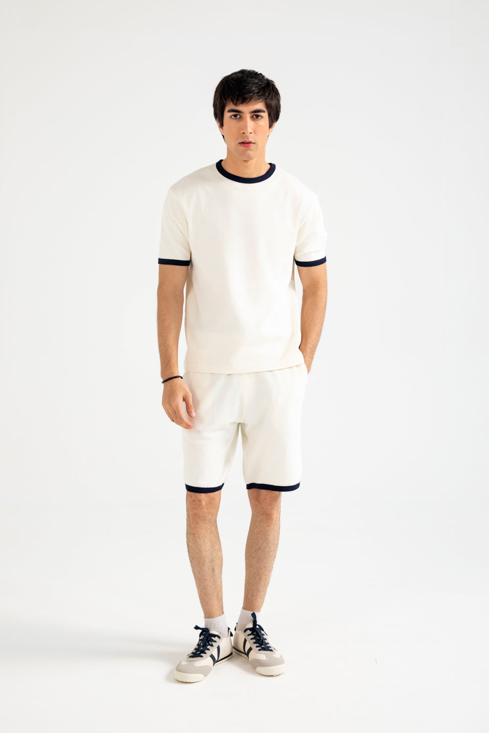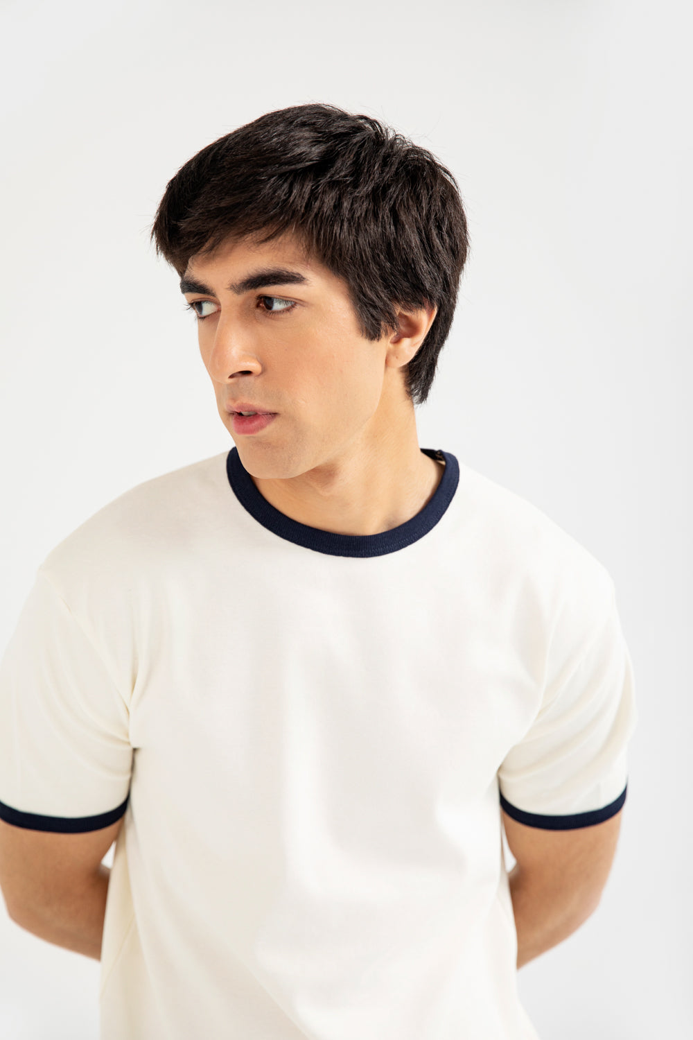 Off-white muscle fit tee in a stretchy cotton synthetic blend, finished with contrasting trim on the neckline and sleeves.