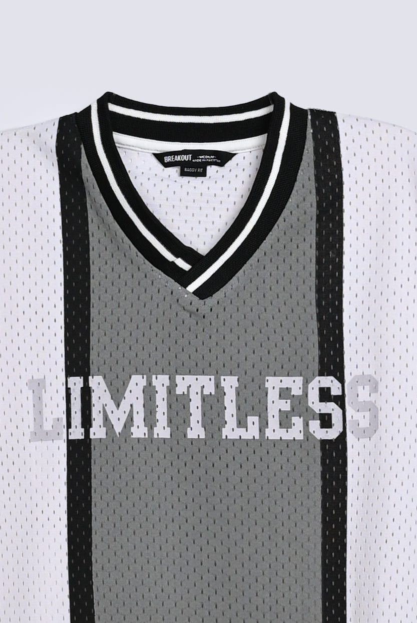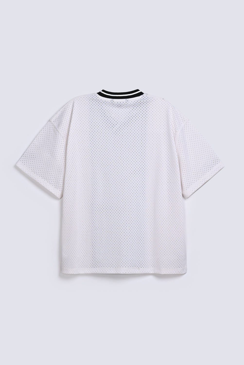 White tee in synthetic perforated fabric with a baggy fit, featuring black text print on the front, a V neckline, and vertical stripes for a sporty look.