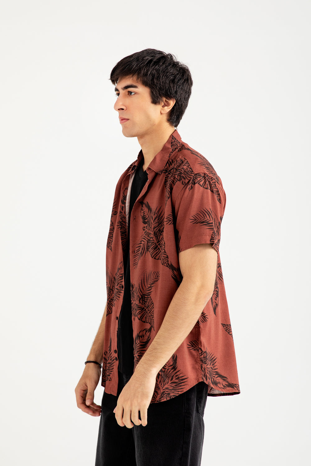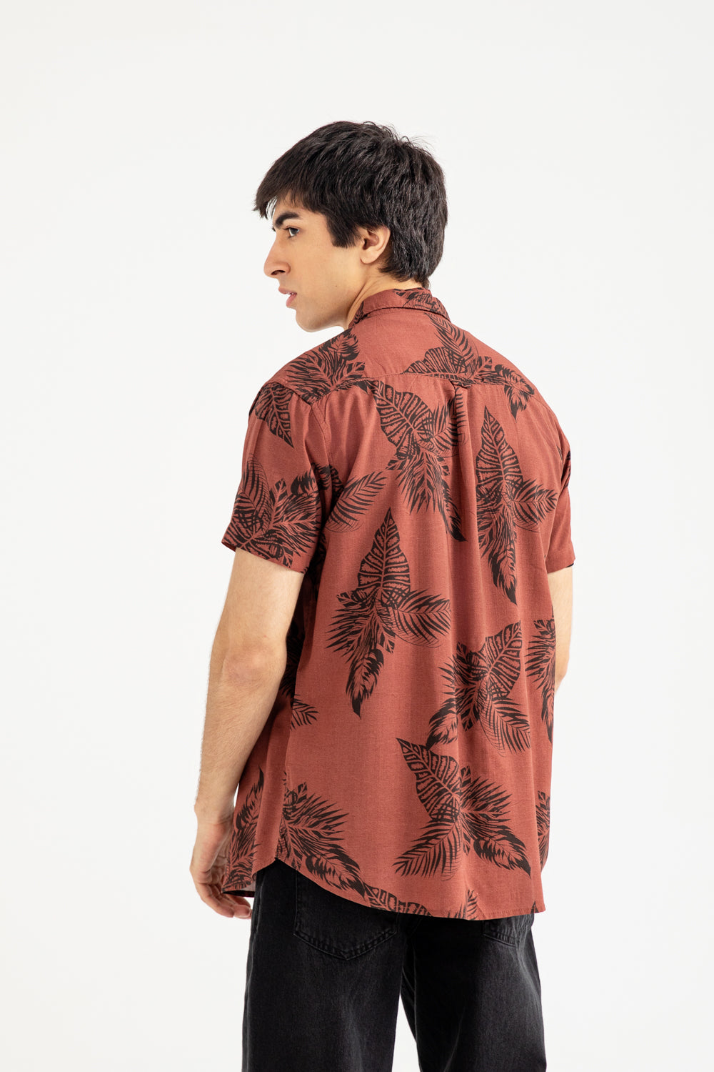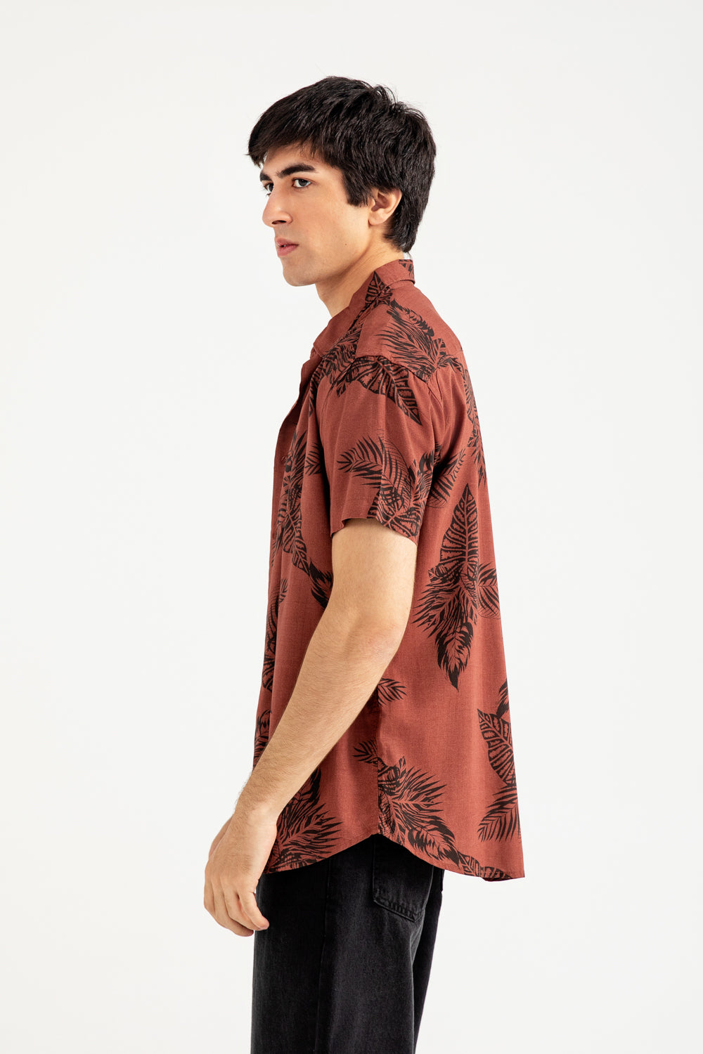 Crafted from a smooth synthetic blend, this rust shirt is covered in a black beachy leaf print and finished with sleek black buttons.