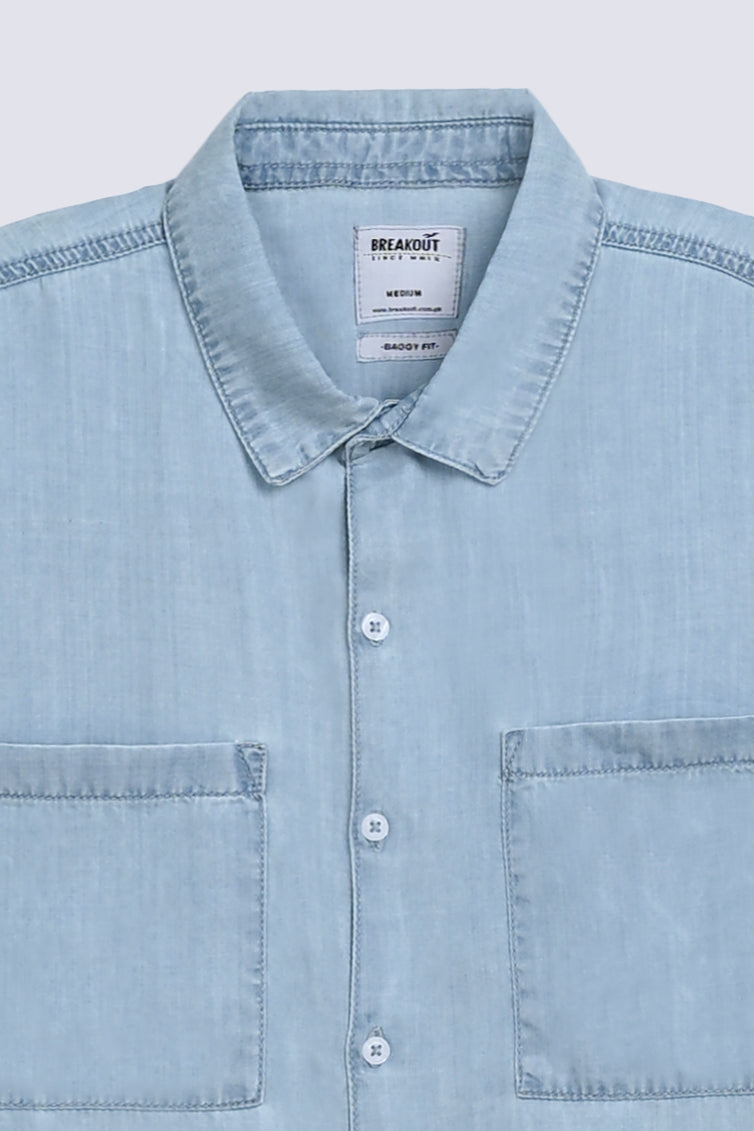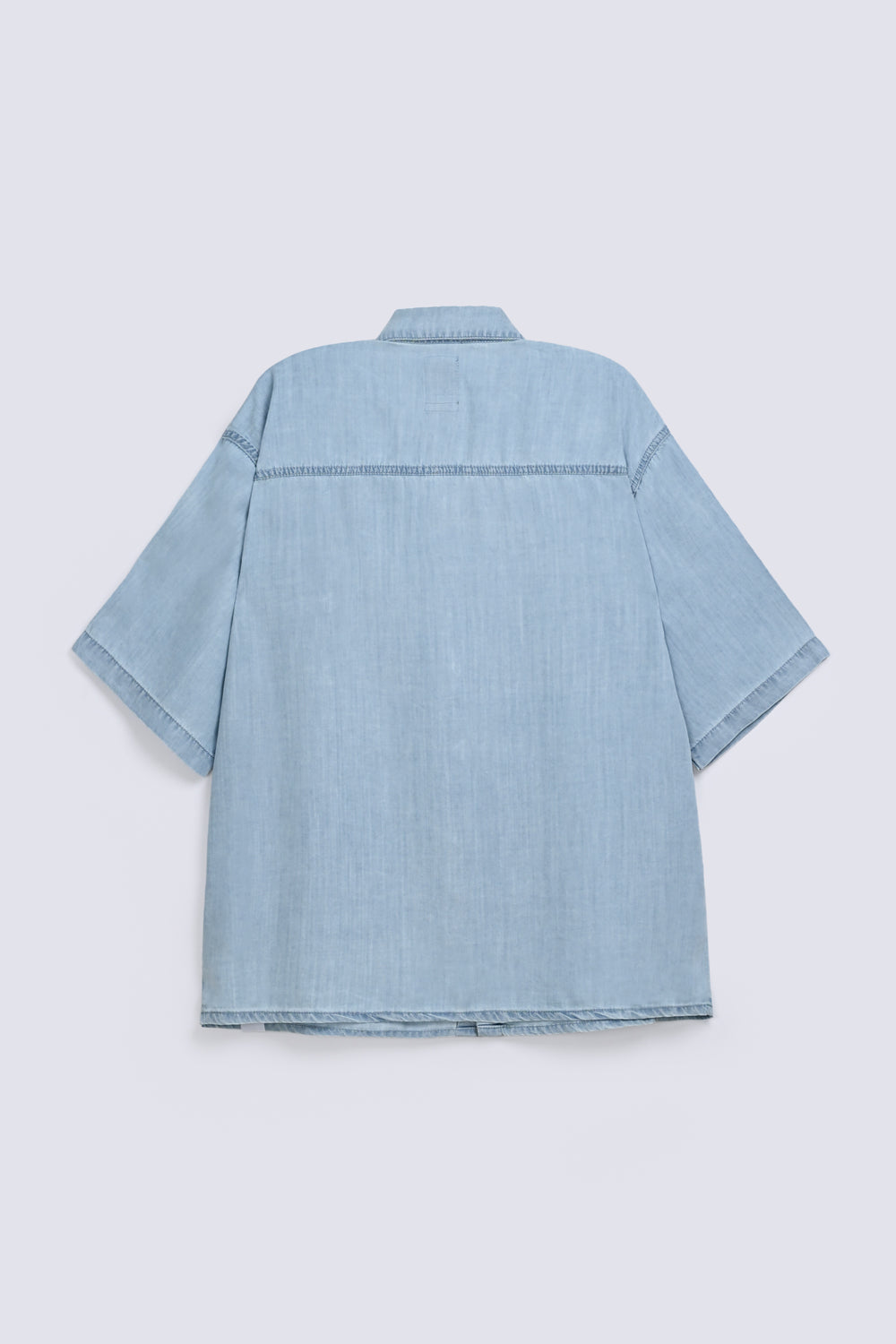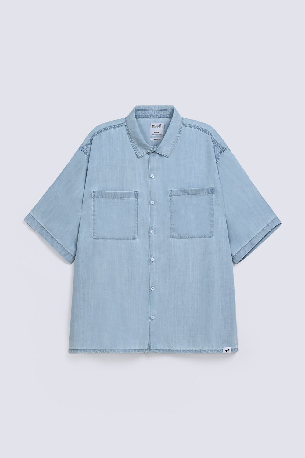 Relaxed fit denim shirt in blue, detailed with white buttons and a chest pocket on each side.