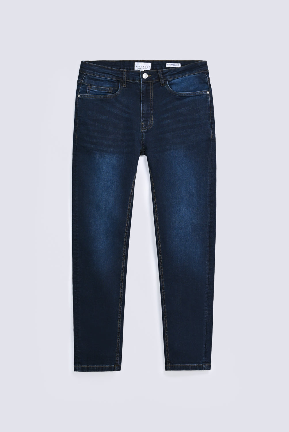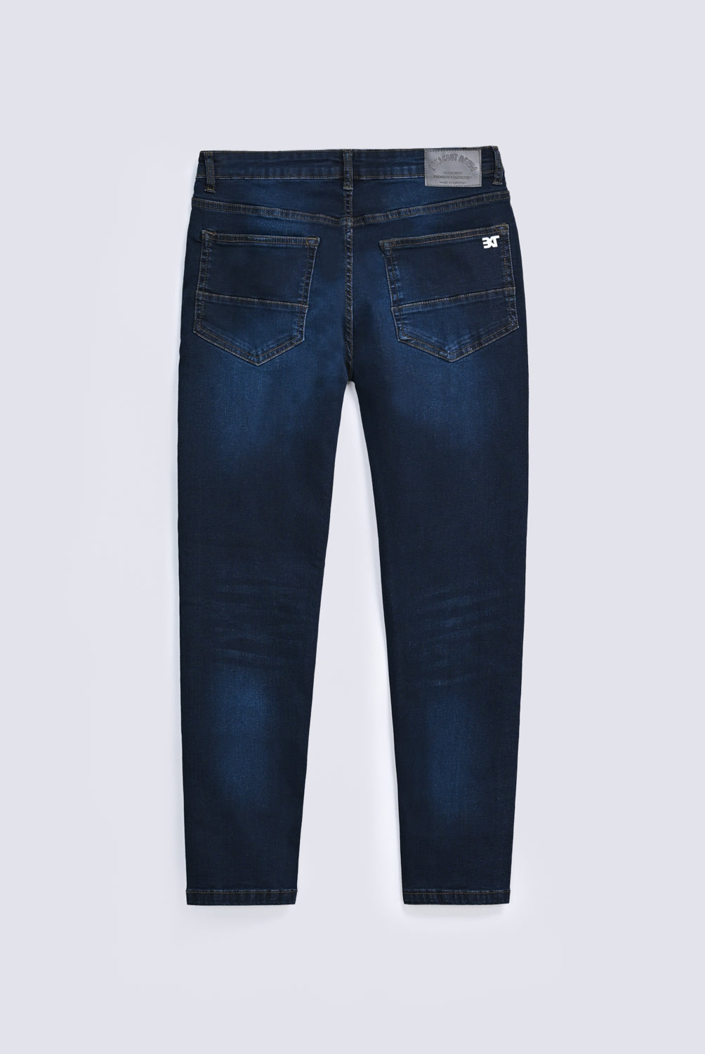 Dark blue denim in a stretchy cotton blend with a slight wash.