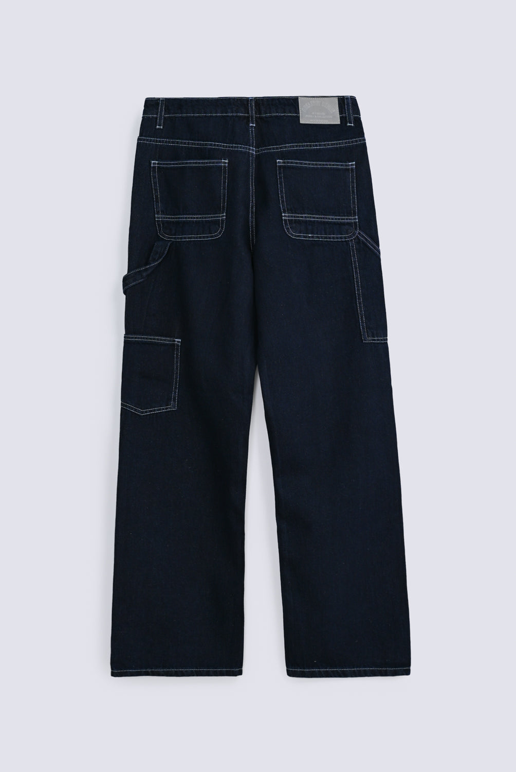 Dark blue cargo denim with contrast white stitching, featuring classic straight legs and subtle design accents at the back.