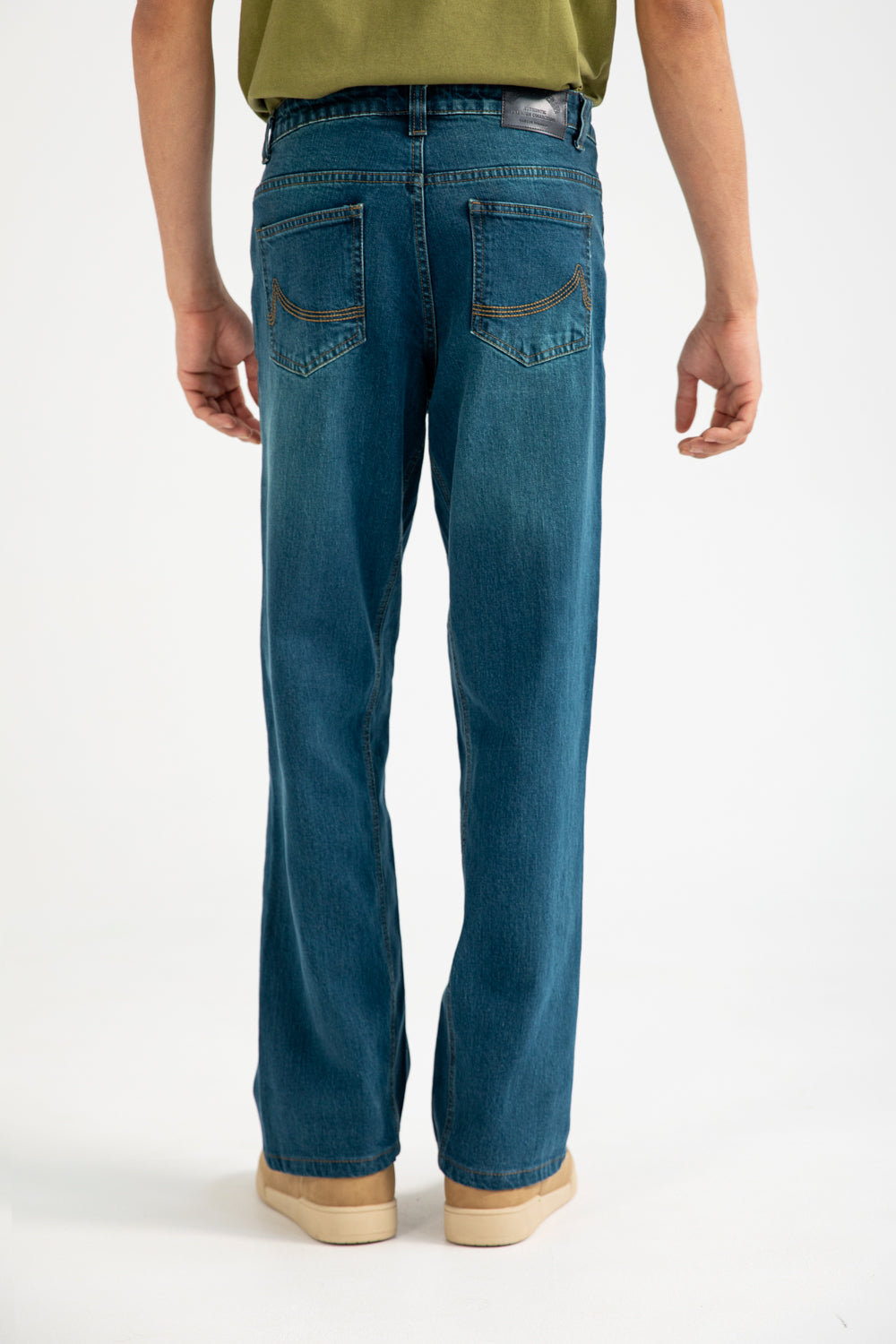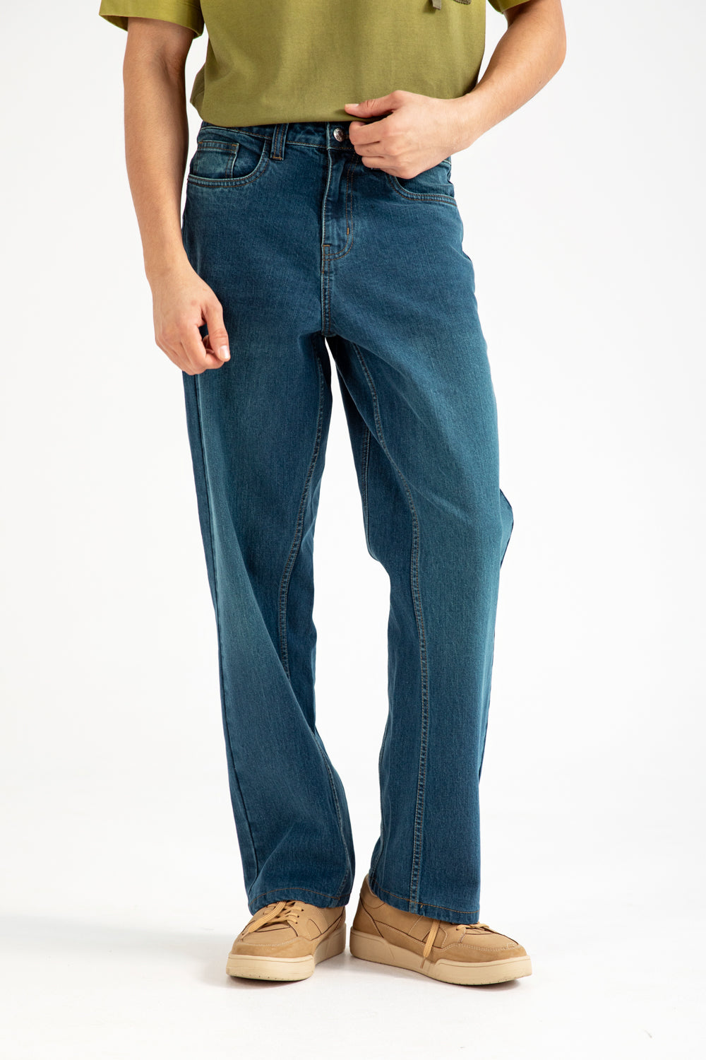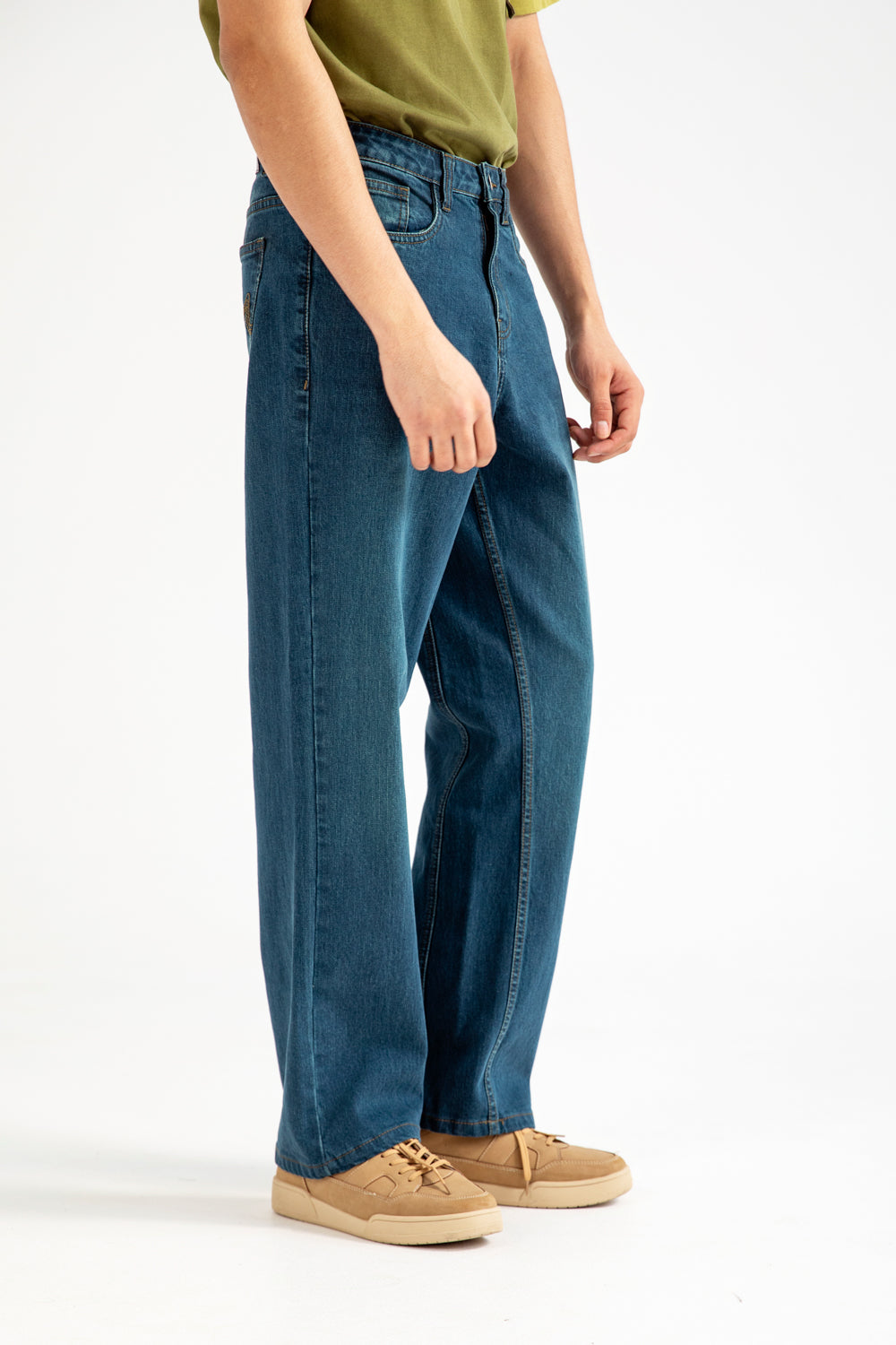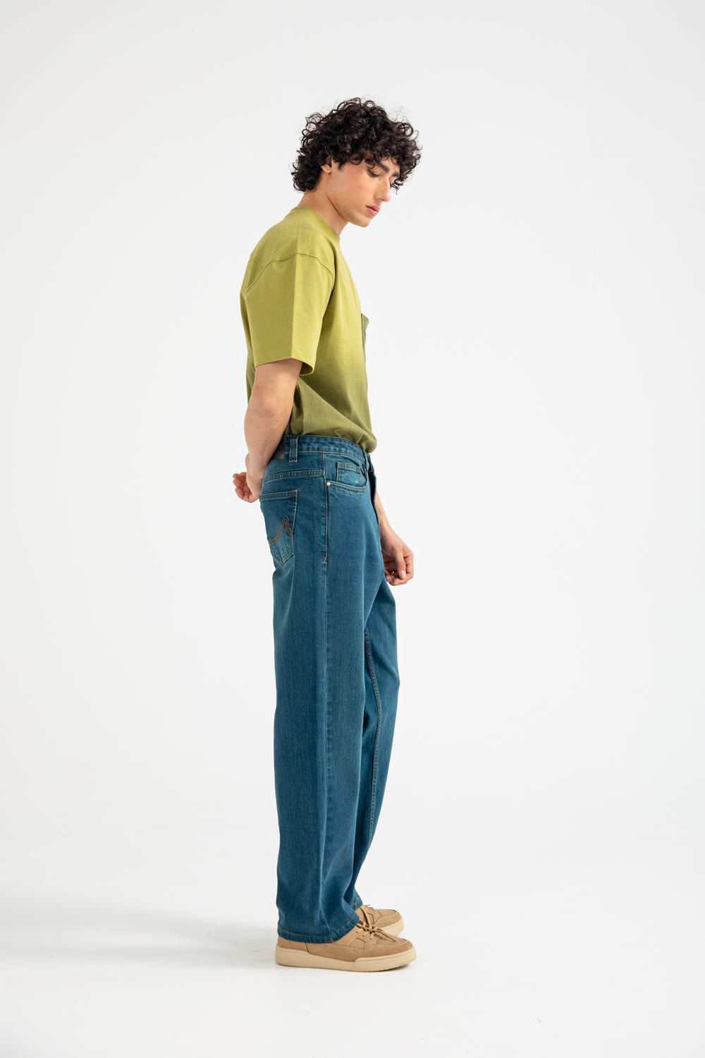 Wide leg denim in a cotton synthetic blend, featuring a blue tone with a hint of green and embroidery detailing on the back pockets.
