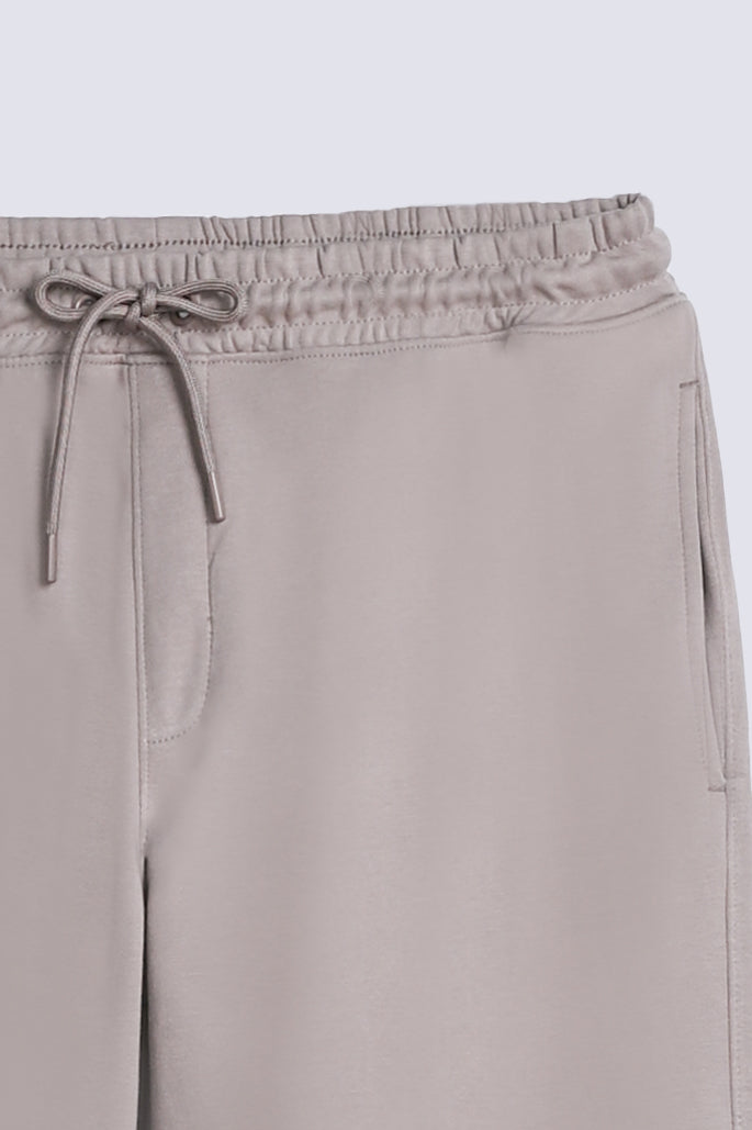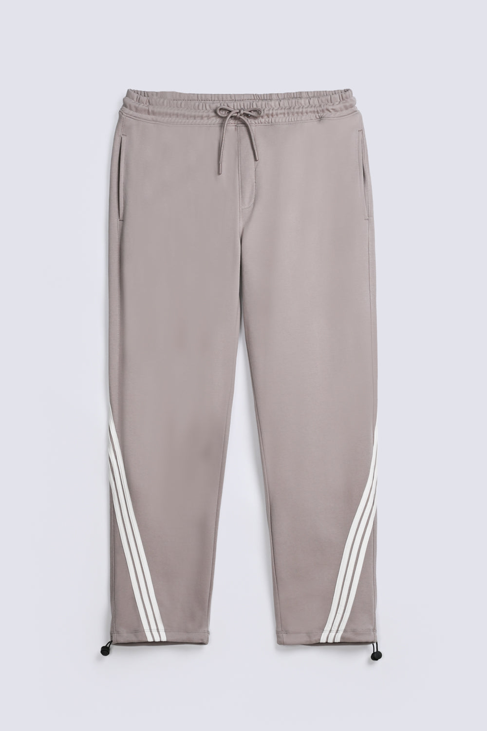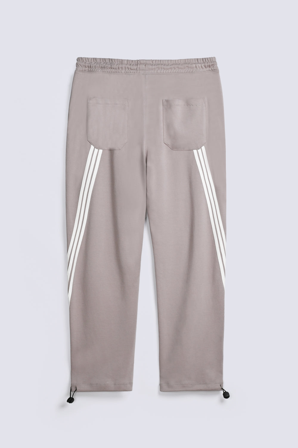 Dusty pink cotton knit trousers in a baggy fit, featuring an elasticated drawstring waistband with white stripes on the front and back.