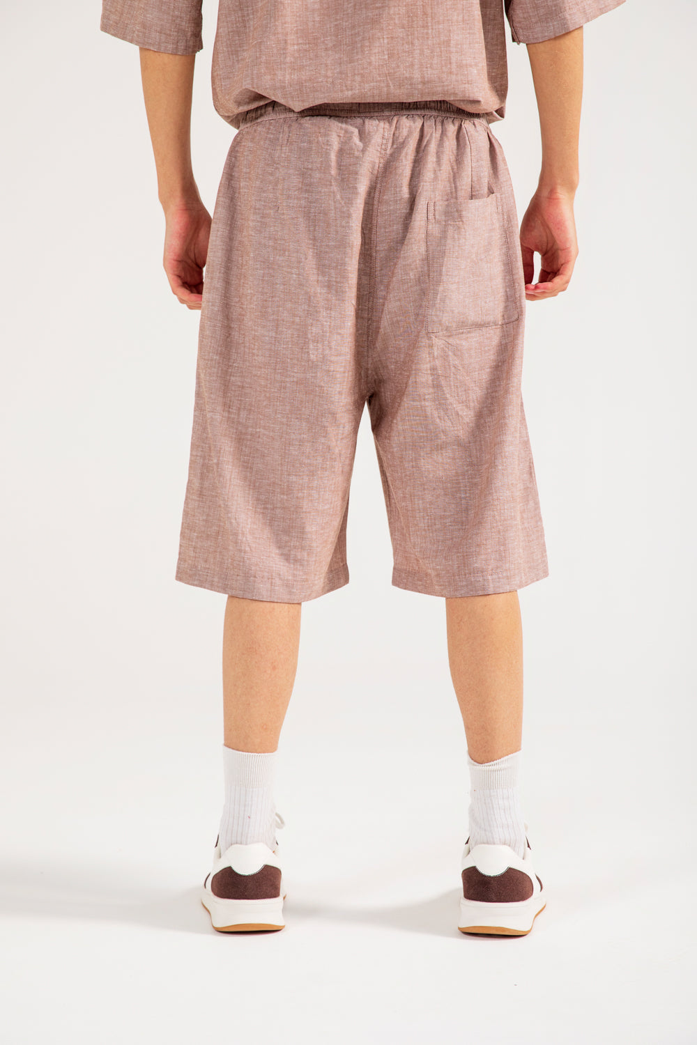 Light brown shorts made from a breathable cotton linen blend. Designed with a relaxed silhouette, elasticated drawstring waistband, side pockets, and a single back pocket.
