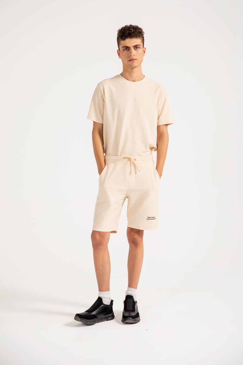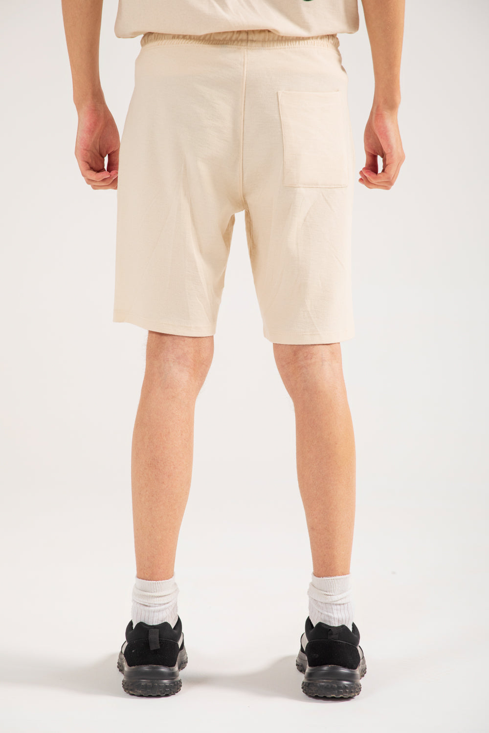Textured knit shorts in cotton featuring a small graphic print on the left leg, an elasticated drawstring waistband, and a single back pocket.