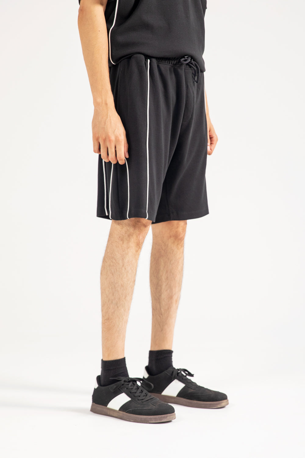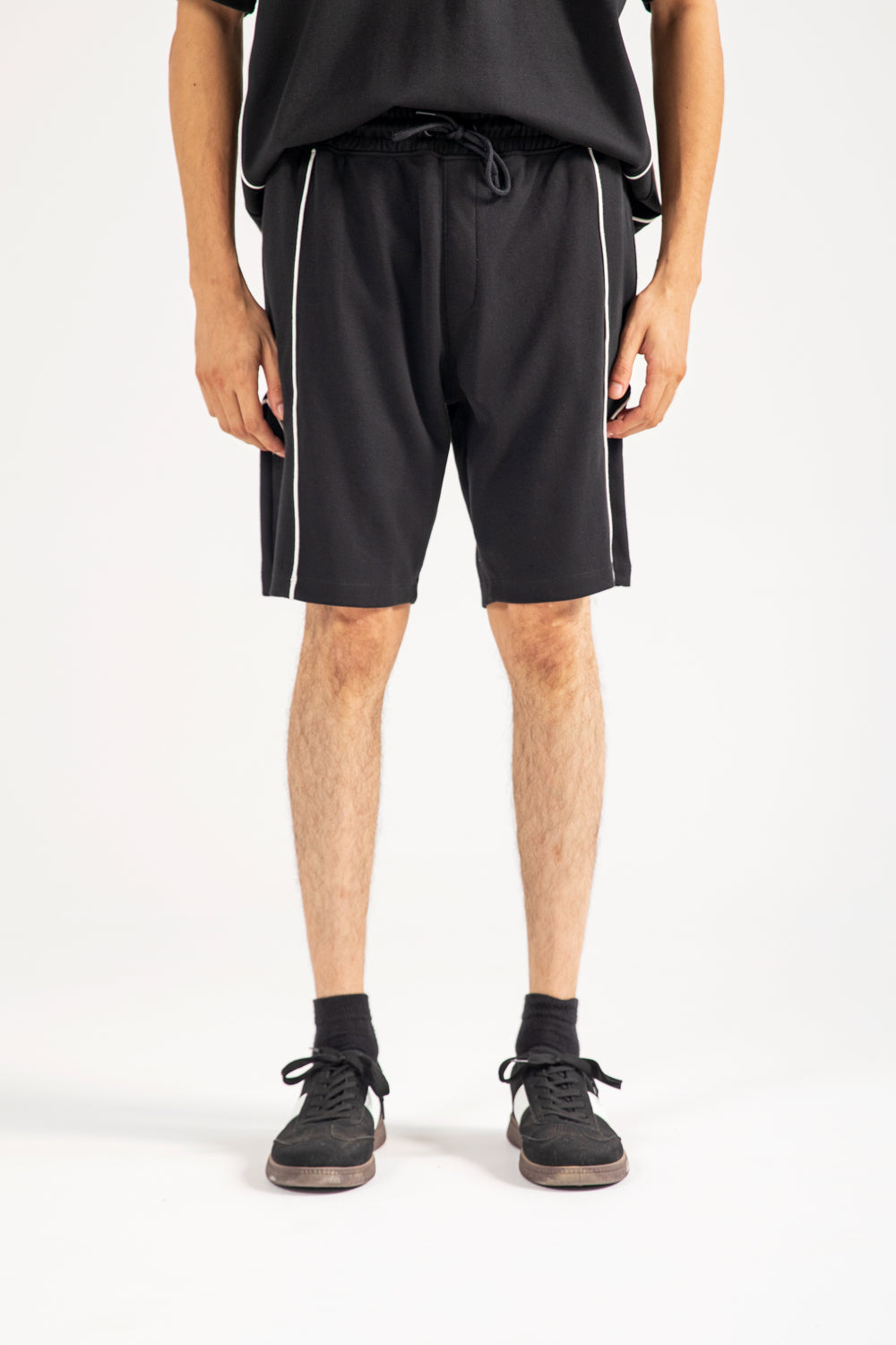 Relaxed black shorts featuring white piping inserts, finished with an elasticated drawstring waistband and side pockets.