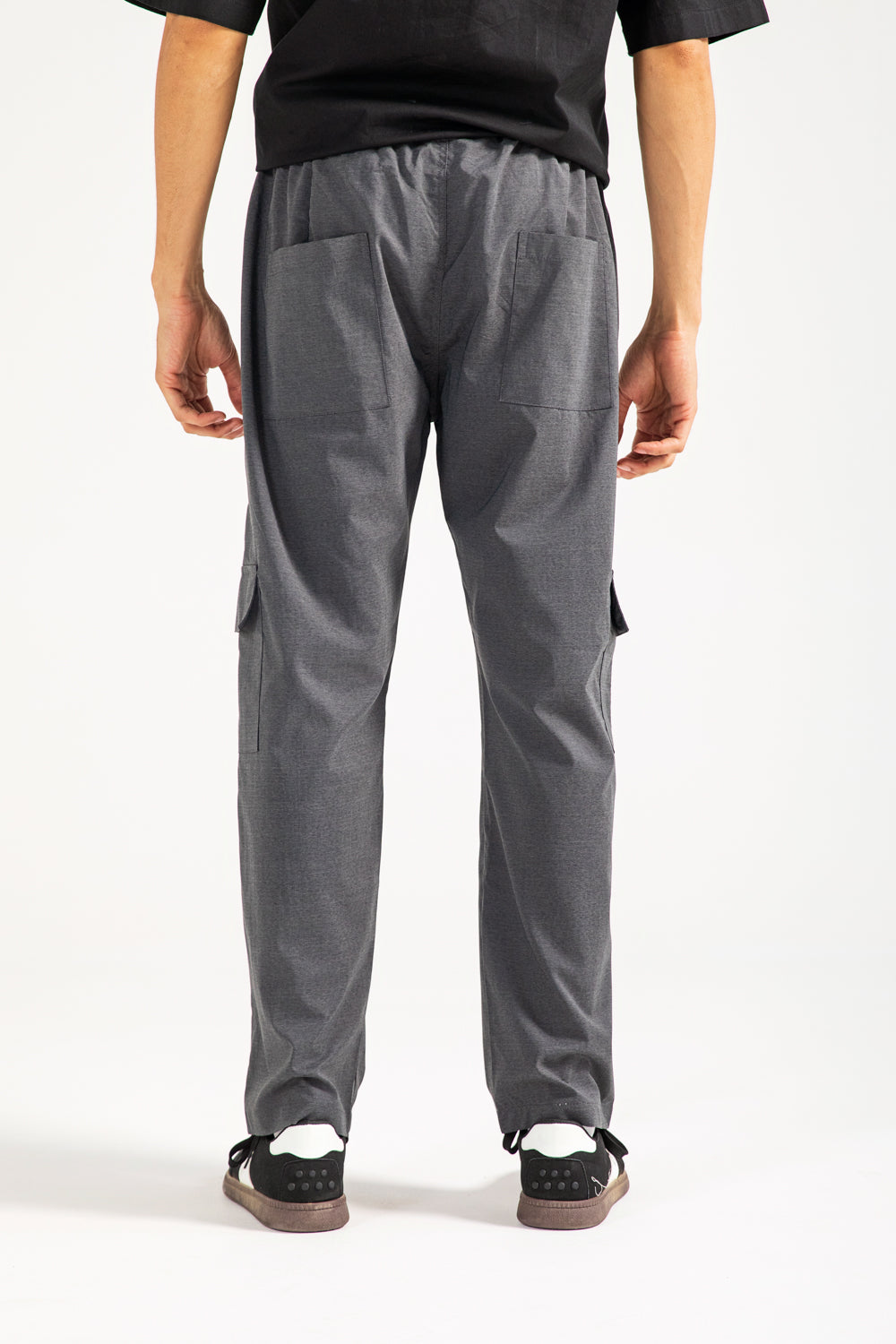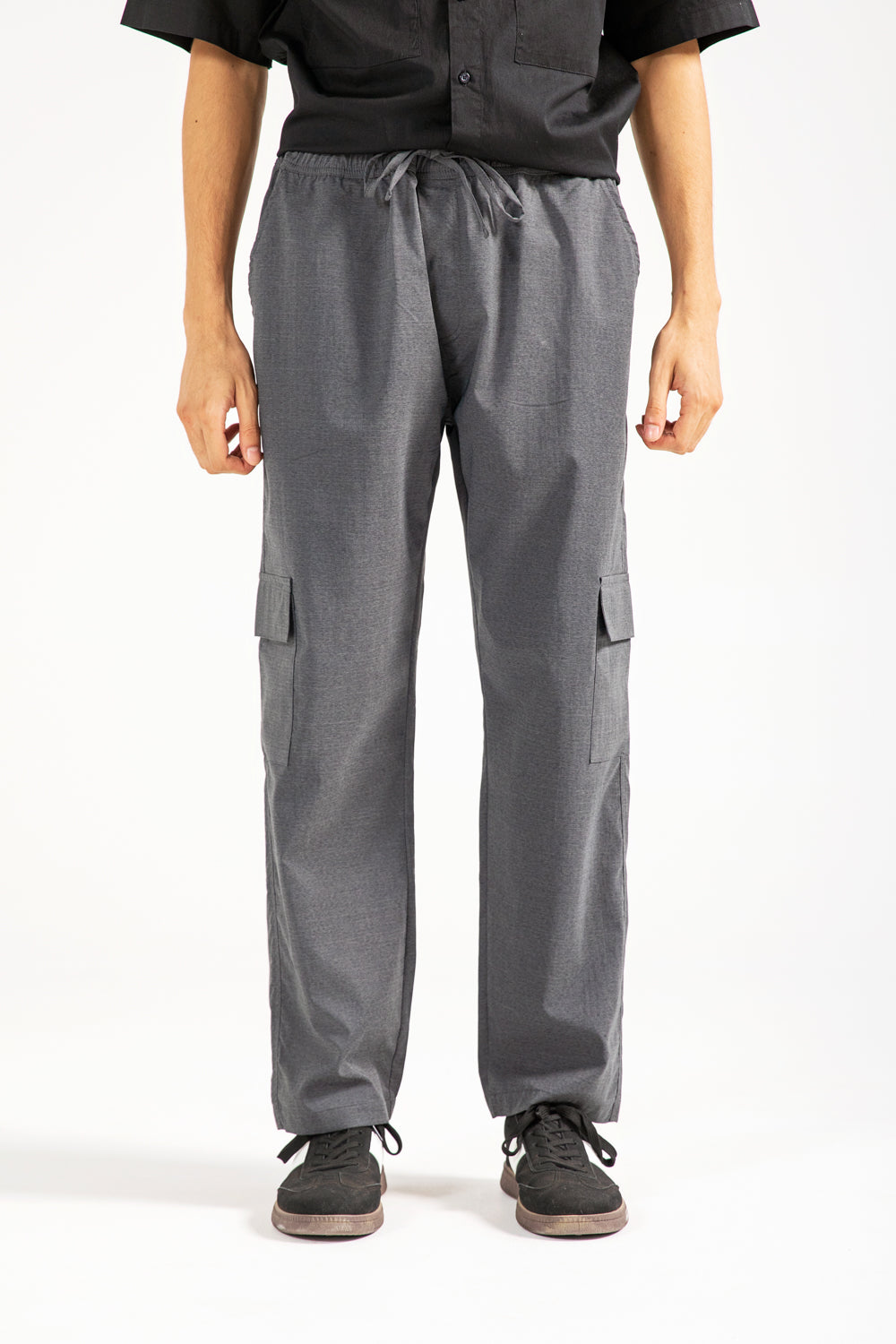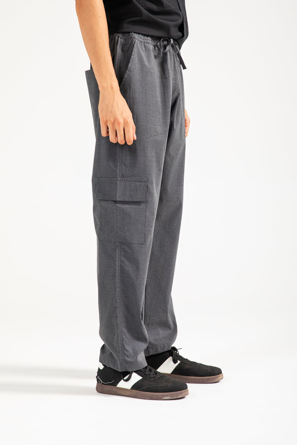 Baggy fit trousers in a breathable cotton synthetic blend featuring two cargo pockets, two back pockets, and an elasticated drawstring waistband.