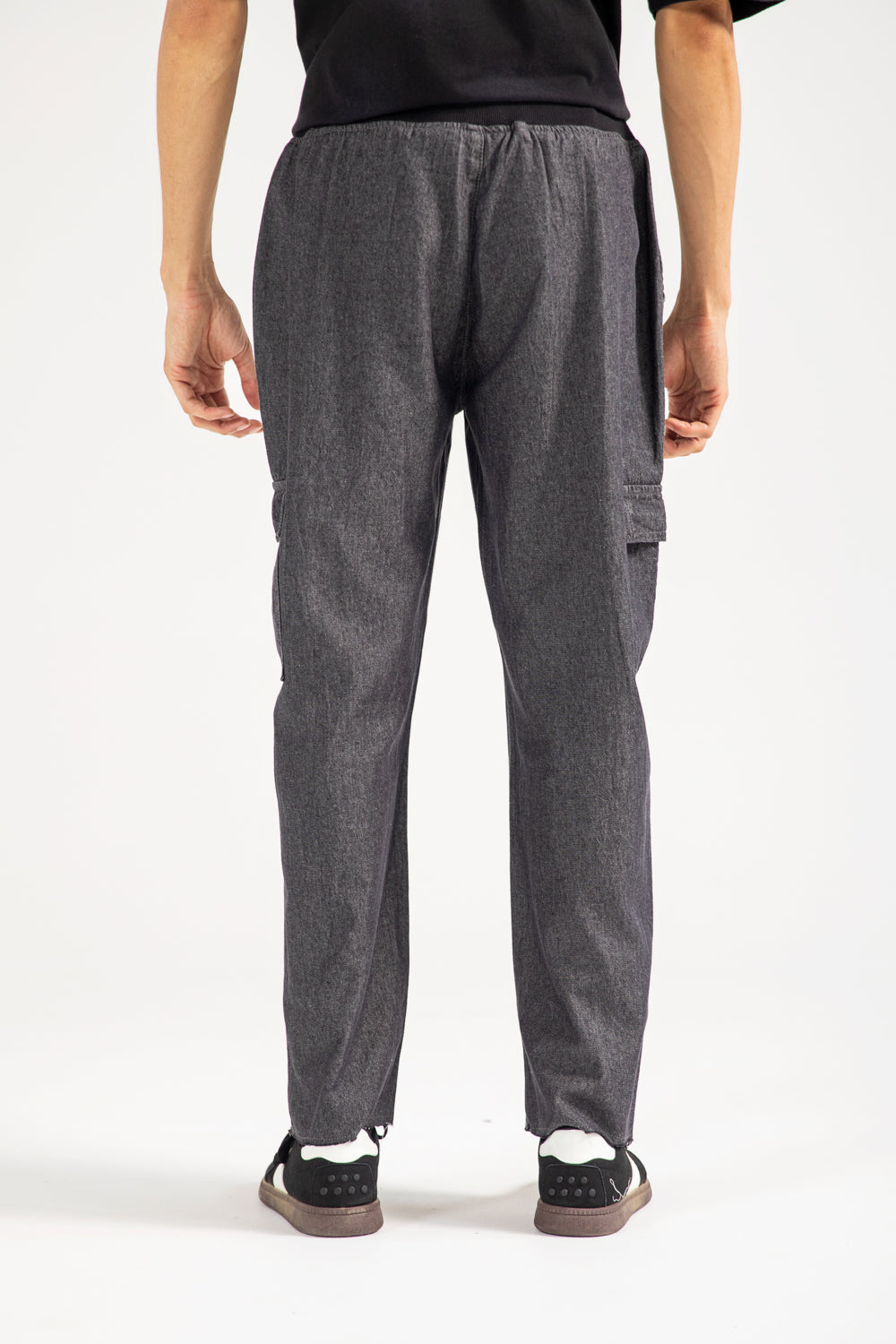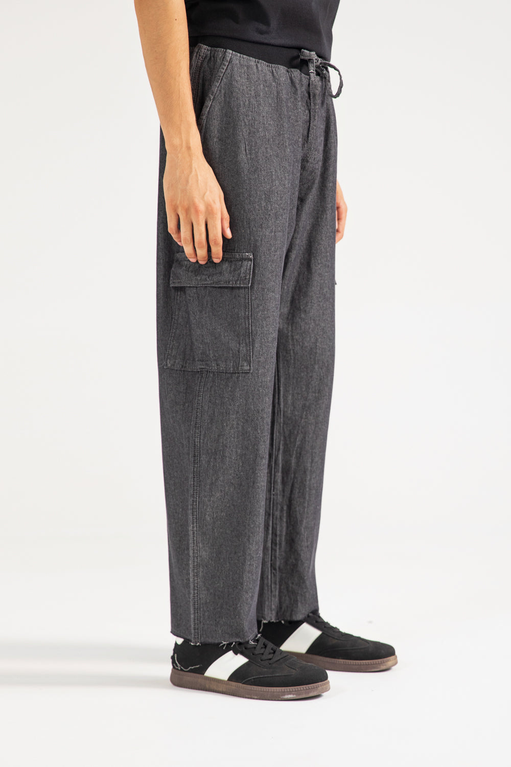 Laid-back black trousers in cotton, styled with a ribbed drawstring waistband and two roomy cargo pockets.