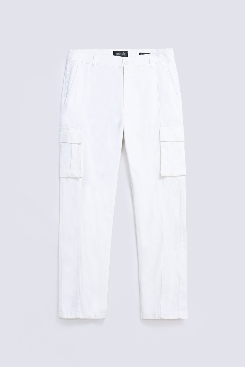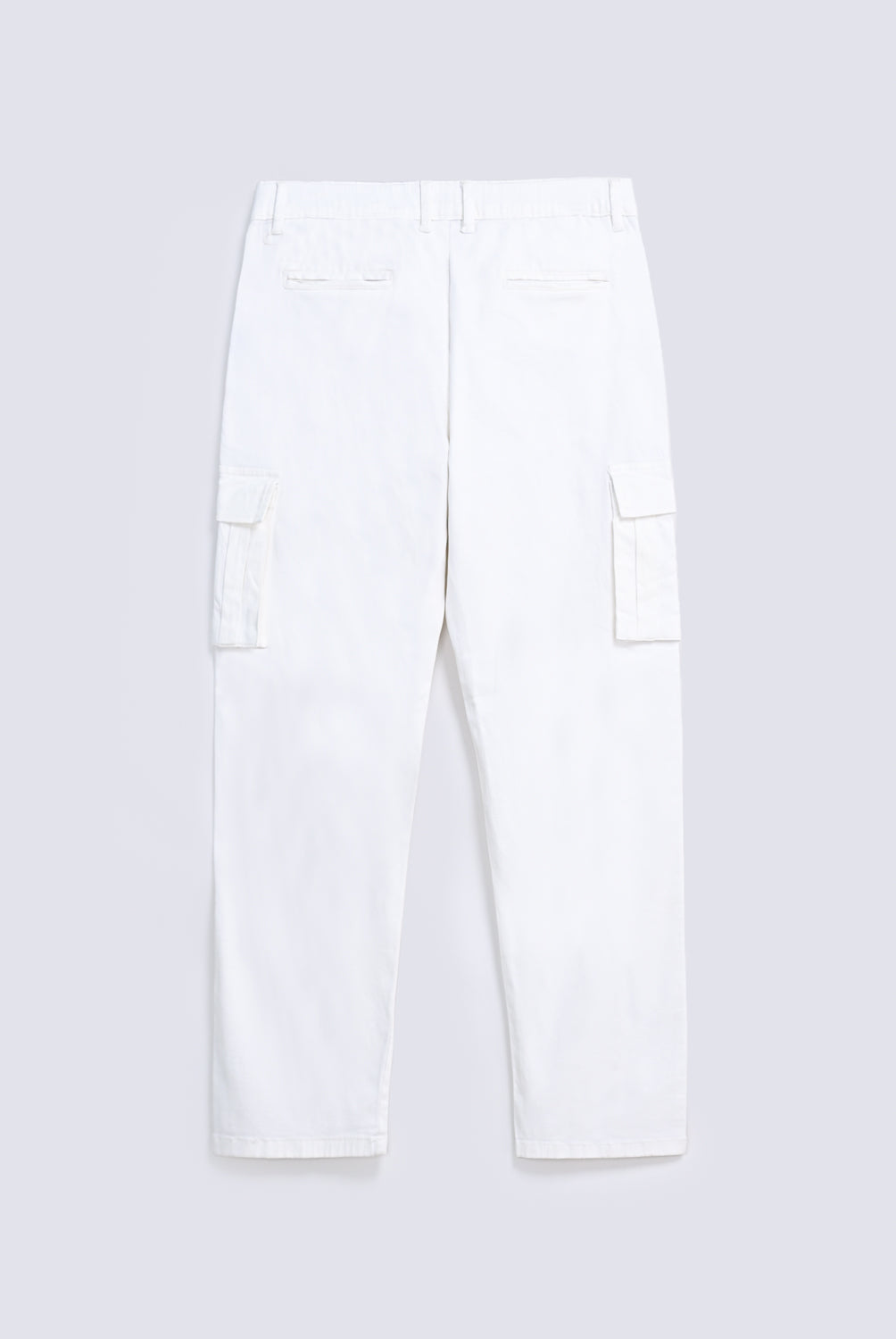 Straight fit cargo trousers in a cotton rich blend, featuring panel detailing, cargo pockets, and welt back pockets in a crisp stark white.