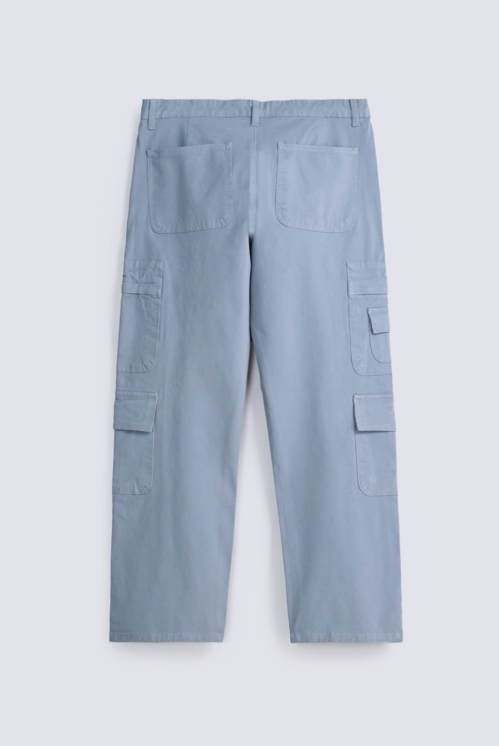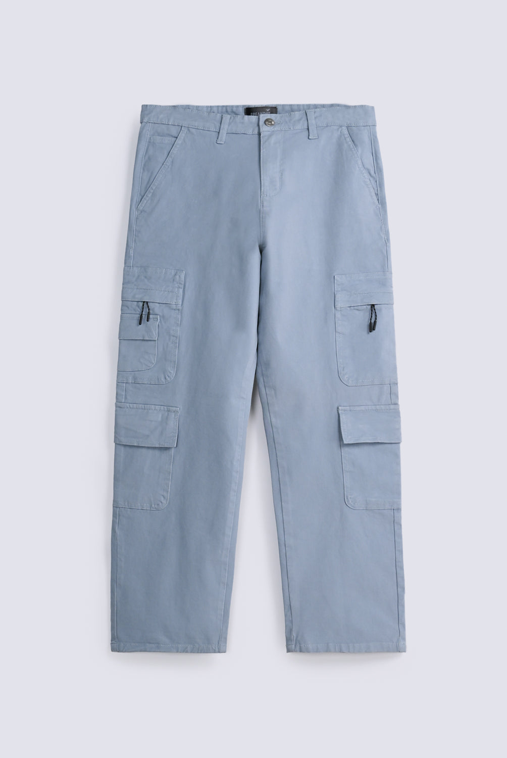 Light grey trousers in a cotton synthetic blend, featuring a cropped length and multiple cargo pockets.