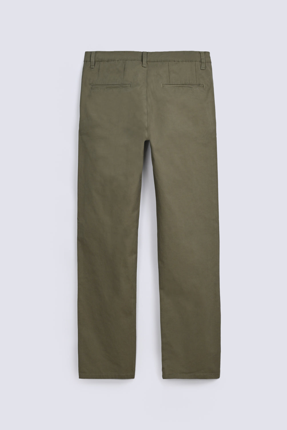 Olive chinos in cotton with a slim relaxed fit, featuring welt pockets at the back.