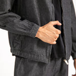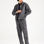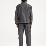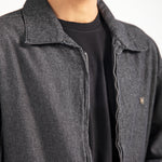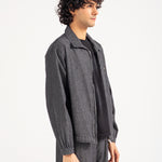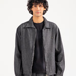 Cotton denim in a washed grey-black tone, finished with a metal zipper closure, side pockets, and full-length sleeves with elasticated cuffs.