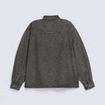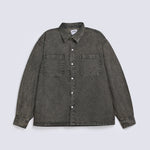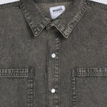 Washed brown denim shirt with a boxy fit, finished with white buttons, dual chest pockets, and full-length sleeves.