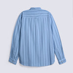 Sky blue viscose shirt with vertical monochrome stripes and a button down front.