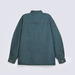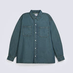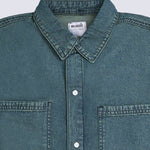 Blue denim shirt with green tint and a boxy fit, finished with white buttons, dual chest pockets, and full-length sleeves.