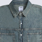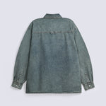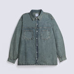 Faded denim shirt with a subtle green tint, designed in a relaxed baggy fit. Features dual chest pockets, full-length sleeves, and white button closures.