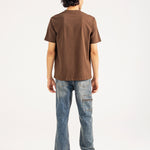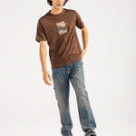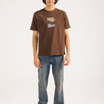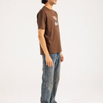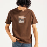 Brown cotton tee featuring minimal abstract artwork at the center front, combining embroidery and print for a textured finish.