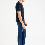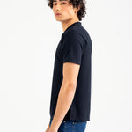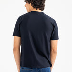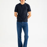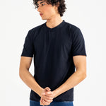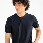 Crafted from a stretchy synthetic blend, this navy Henley tee features a clean design with a single matching button at the neckline.