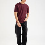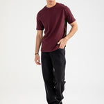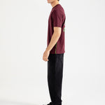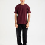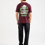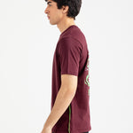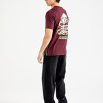 Burgundy cotton tee with a plain front and a large graphic print across the back.