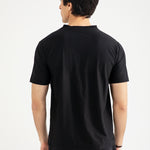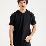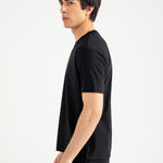 Black plain tee in a synthetic blend with a smooth, super soft feel.