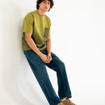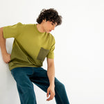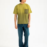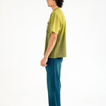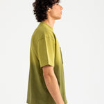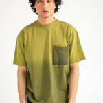 Green cotton tee in a baggy fit, featuring a washed effect that fades from light to dark on both sides, with a mesh chest pocket in a matching tone.