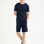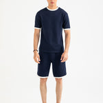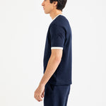 Navy muscle fit tee in a stretchy cotton synthetic blend, finished with contrasting trim on the neckline and sleeves.