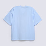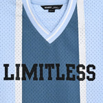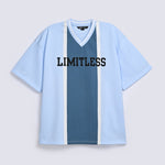 Blue tee in synthetic perforated fabric with a baggy fit, featuring black text print on the front, a V neckline, and vertical stripes for a sporty look.