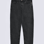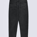 Black cotton denim with a light fade and a loose cropped fit, bringing a laid-back vibe to a classic look.