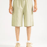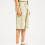 Light green shorts made from a breathable cotton linen blend. Designed with a relaxed silhouette, elasticated drawstring waistband, side pockets, and a single back pocket.