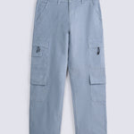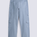 Light grey trousers in a cotton synthetic blend, featuring a cropped length and multiple cargo pockets.