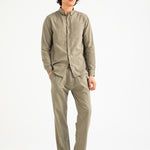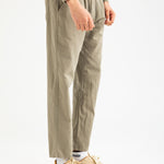 Olive trousers in a cotton linen blend, featuring a straight leg with side pockets and back pockets on each side.