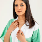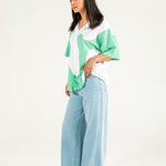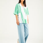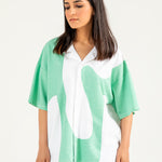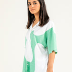 Soft terry shirt with an abstract green and white wavy print, finished with a white button-down front.