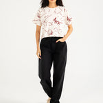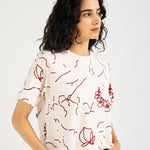 Off white cotton cropped tee featuring an all over red abstract print.
