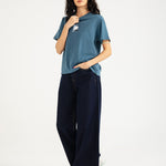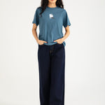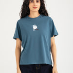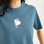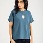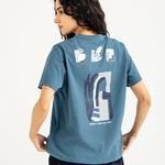 Teal cotton tee with a small graphic on the front and a matching larger print on the back.