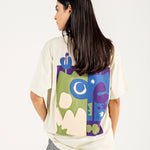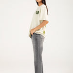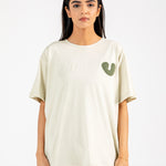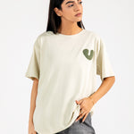Cotton tee in soft sage green featuring a small towel-textured embroidered patch on the front and a standout graphic across the back.