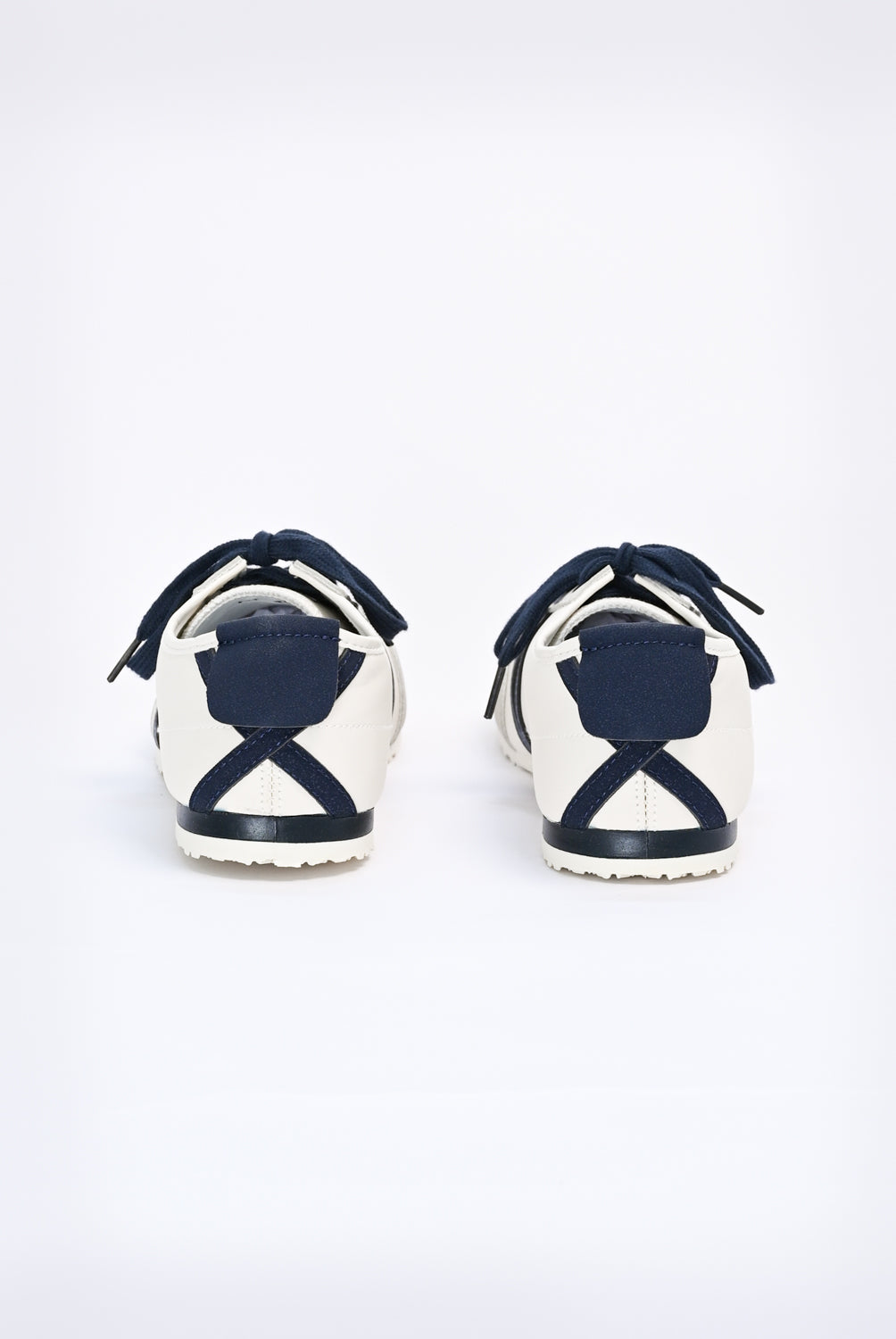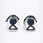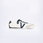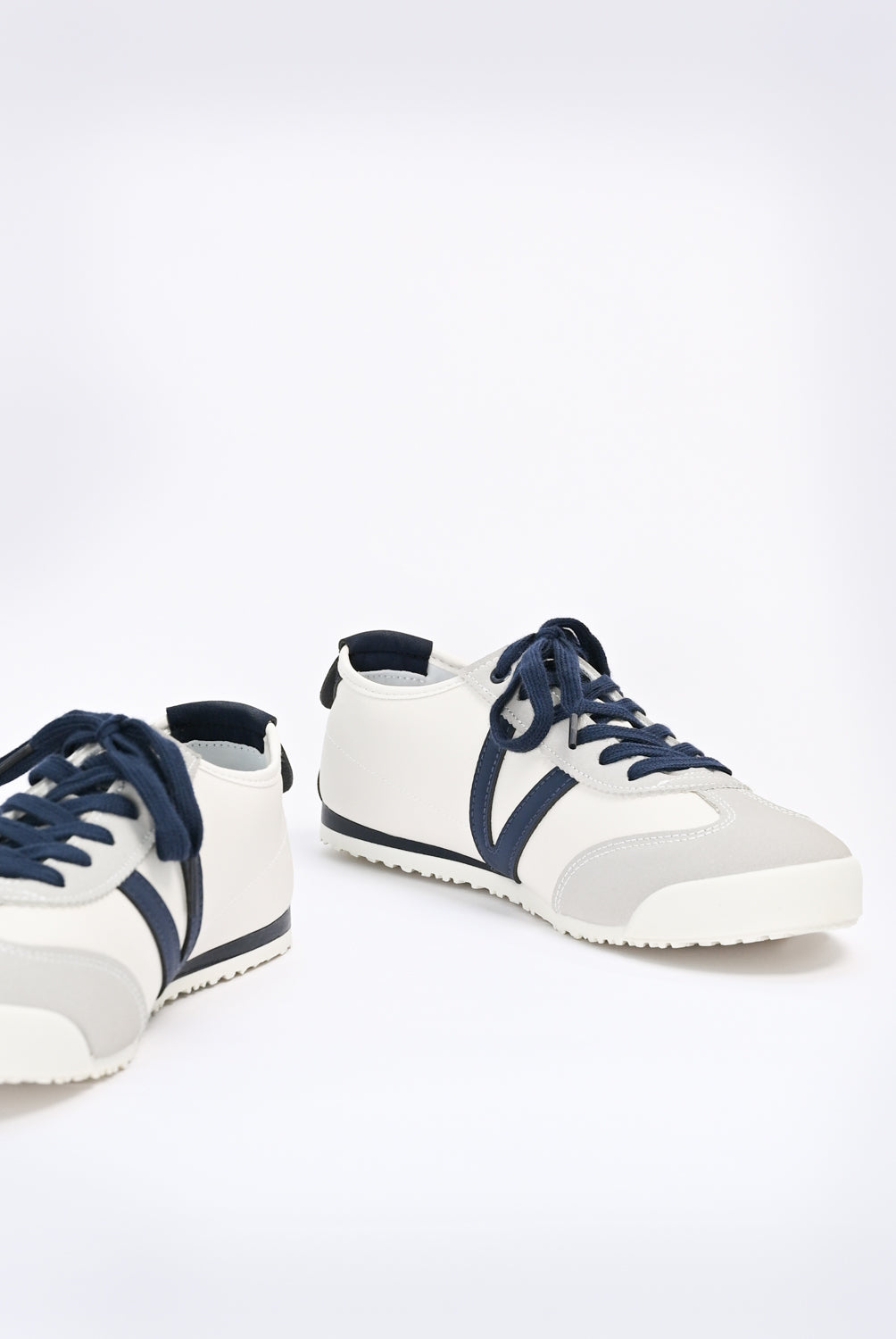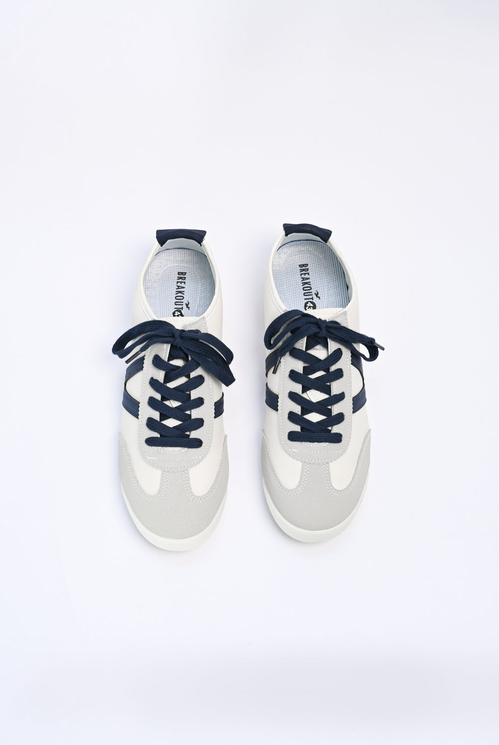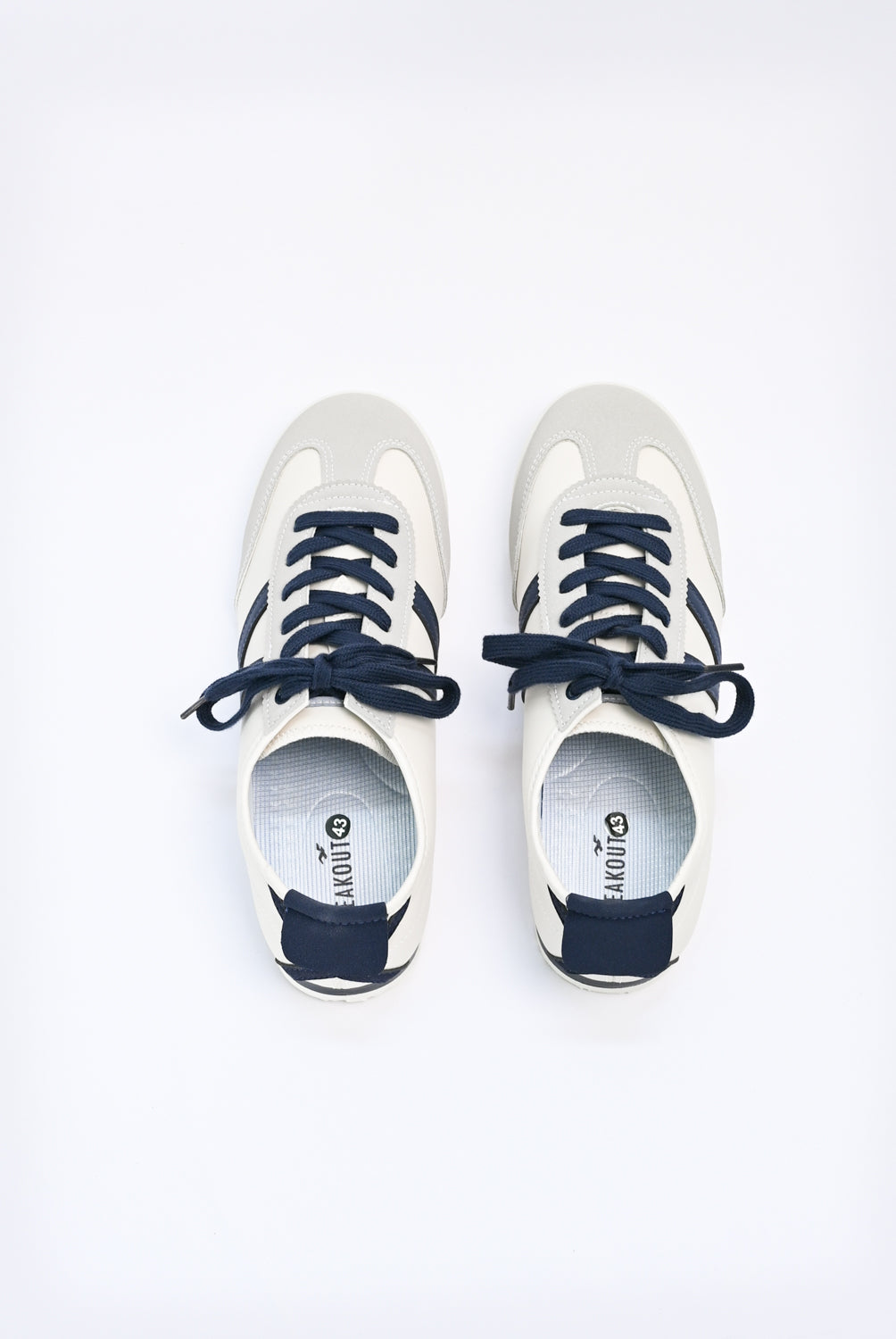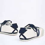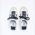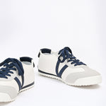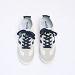 Sneakers with an off-white base, finished with navy laces and matching accents.