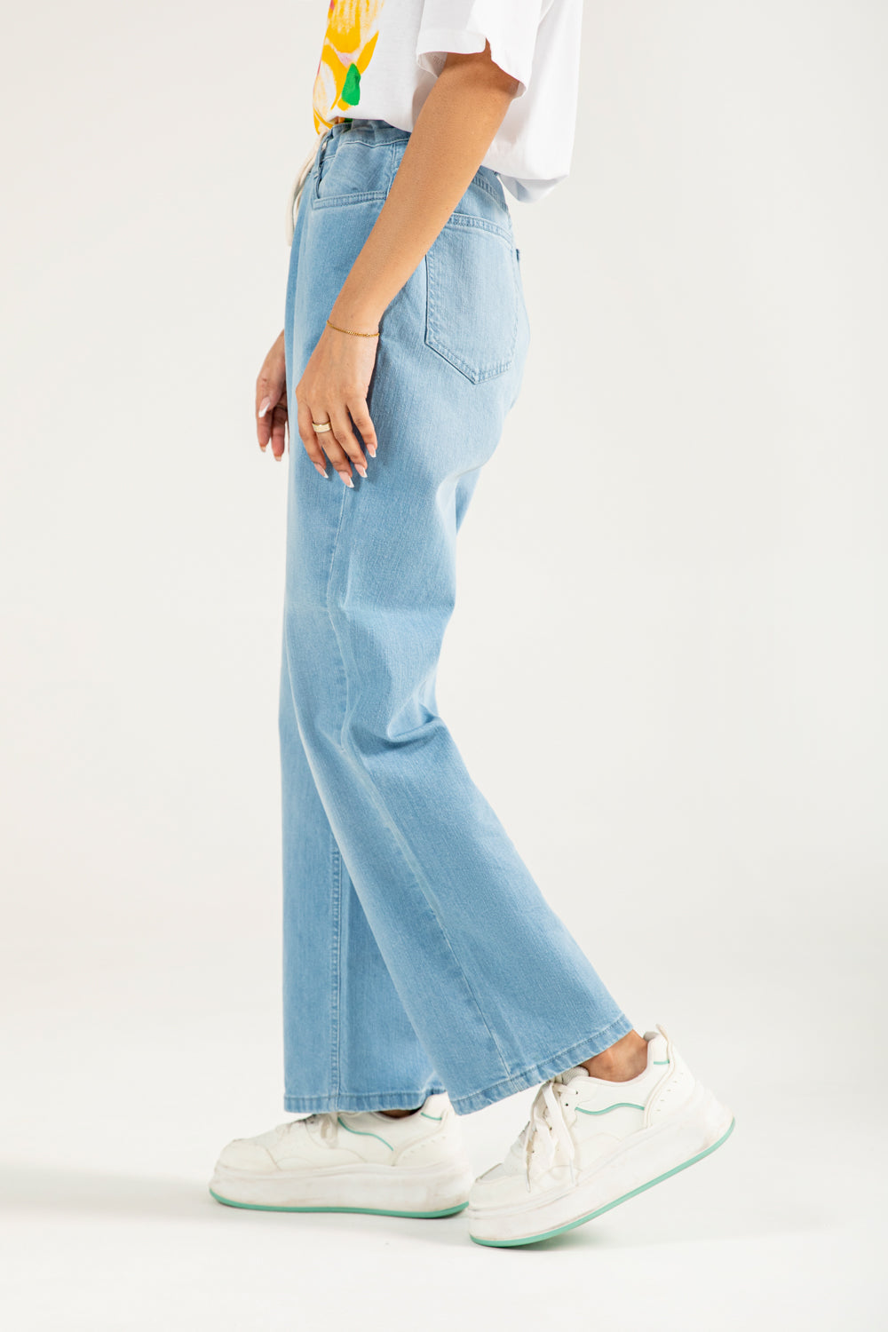 Light blue cotton blend denim featuring a relaxed straight fit and a drawcord waistband detail.