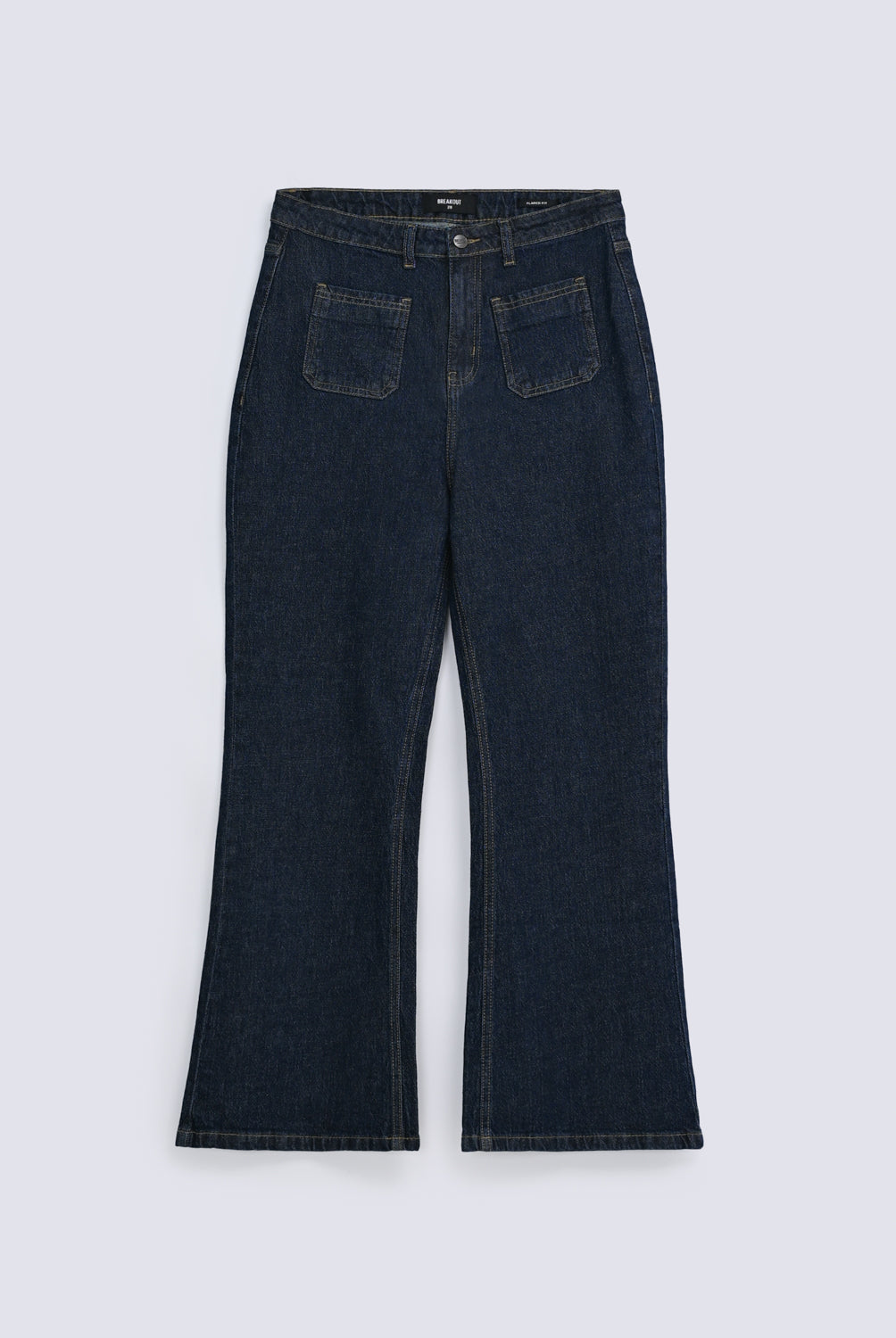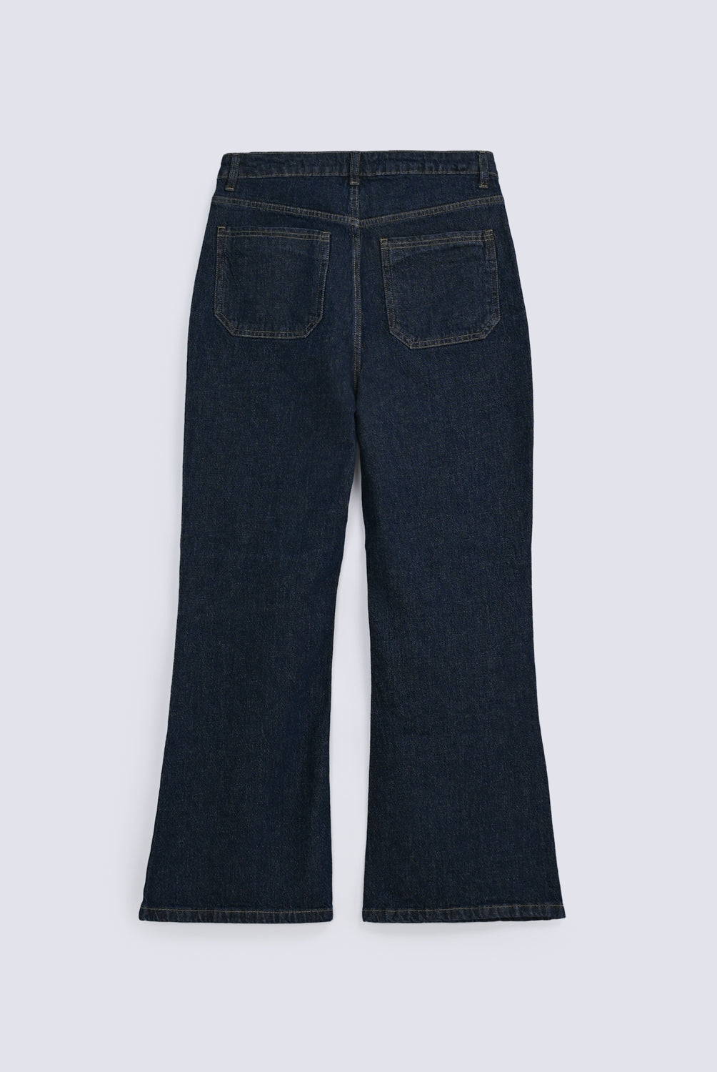 Blue denim in a cotton synthetic blend with subtle vintage wash, finished with a dramatic flare.