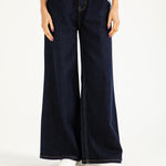 Crafted from dark blue cotton denim, this ultra wide fit style is accented with bold yellow thread stitching.