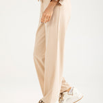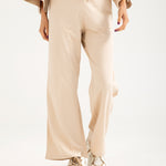 Plain beige wide leg trousers in stretchy cotton with an elasticated drawstring waistband.