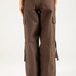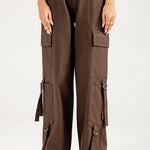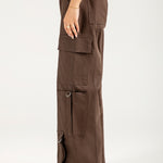 Dark brown wide-leg trousers made from structured cotton blend, featuring large cargo pockets and buckle strap details for a bold, utility-driven look.