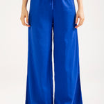 Flowy royal blue trousers in a lightweight synthetic fabric, finished with an elasticated drawstring waistband.