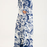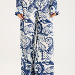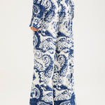 Satin trousers with an elasticated drawstring waistband, featuring an all over blue print on a white base.